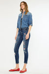 Our Coco Mid Rise Jeans come in an ankle skinny cut with distressed details and plaid patches. Sits right at the natural waistline as it tapers down the leg creating a classic skinny jean silhouette that'll hug your every curve. Made with buttery-soft stretch denim that's flexible, breathable, and durable. Features a classic five-pocket design, single-button front, and zip-fly closure.