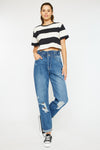 Our Olivia Ultra High Rise Jeans come in a cute boyfriend cut with open knee destruction, paperbag waist, and a folded hem. Sits high above the natural waistline as it relaxes down the legs giving you a comfortable fit that's trendy and stylish. Made with rigid denim that holds its shape while giving you a comfortable fit and feel every time you wear them. Features a four-pocket design, single-button front, and zip-fly closure.