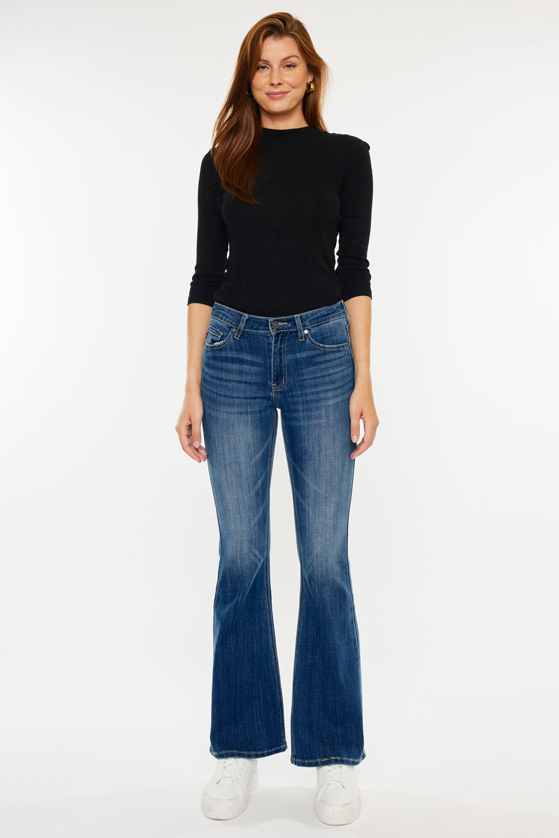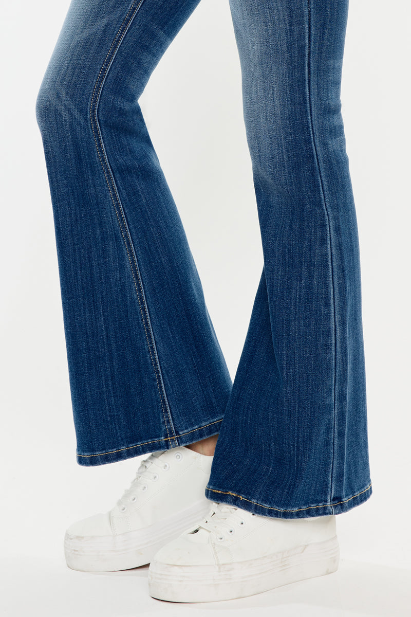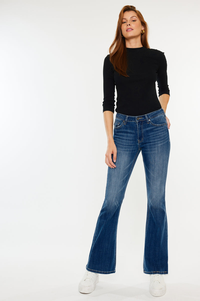 Express your style sense with this pair of flare jeans featuring a mid-rise waistline, whiskering, fading, slight distressing at pocket lines, contrast stitching, single-button closure with zip-fly at the front, and a 5-pocket design.