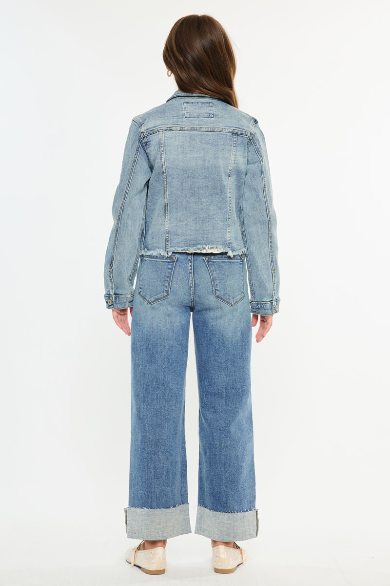 The Abby denim jacket is a must-have in your closet! A medium wash that makes it easy to pair with your favorite outfits. A frayed hem to give it a flare of style! With a basic collar, a button down closure, 2 side pockets and a 2 button-flap pocket