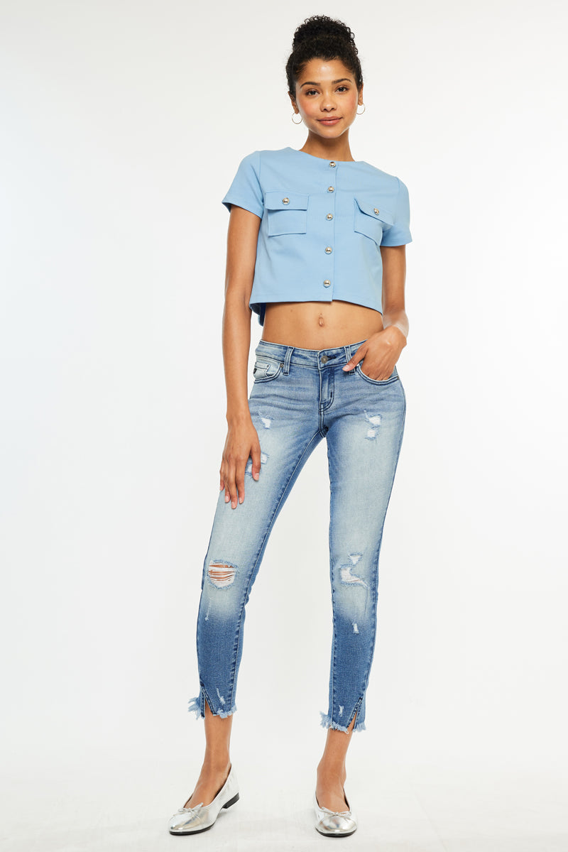 Our Adell Low Rise Jeans come in a classic ankle skinny cut with tattered destruction on the front, a raw hem, and a faded blue wash. Sits slightly below the natural waistline as it tapers down the leg creating a skin-tight silhouette that enhances your figure. Made with comfortably soft stretch denim that gives you a butter-soft feel and flexible fit. Features a classic five-pocket design, single-button front, and zip-fly closure.