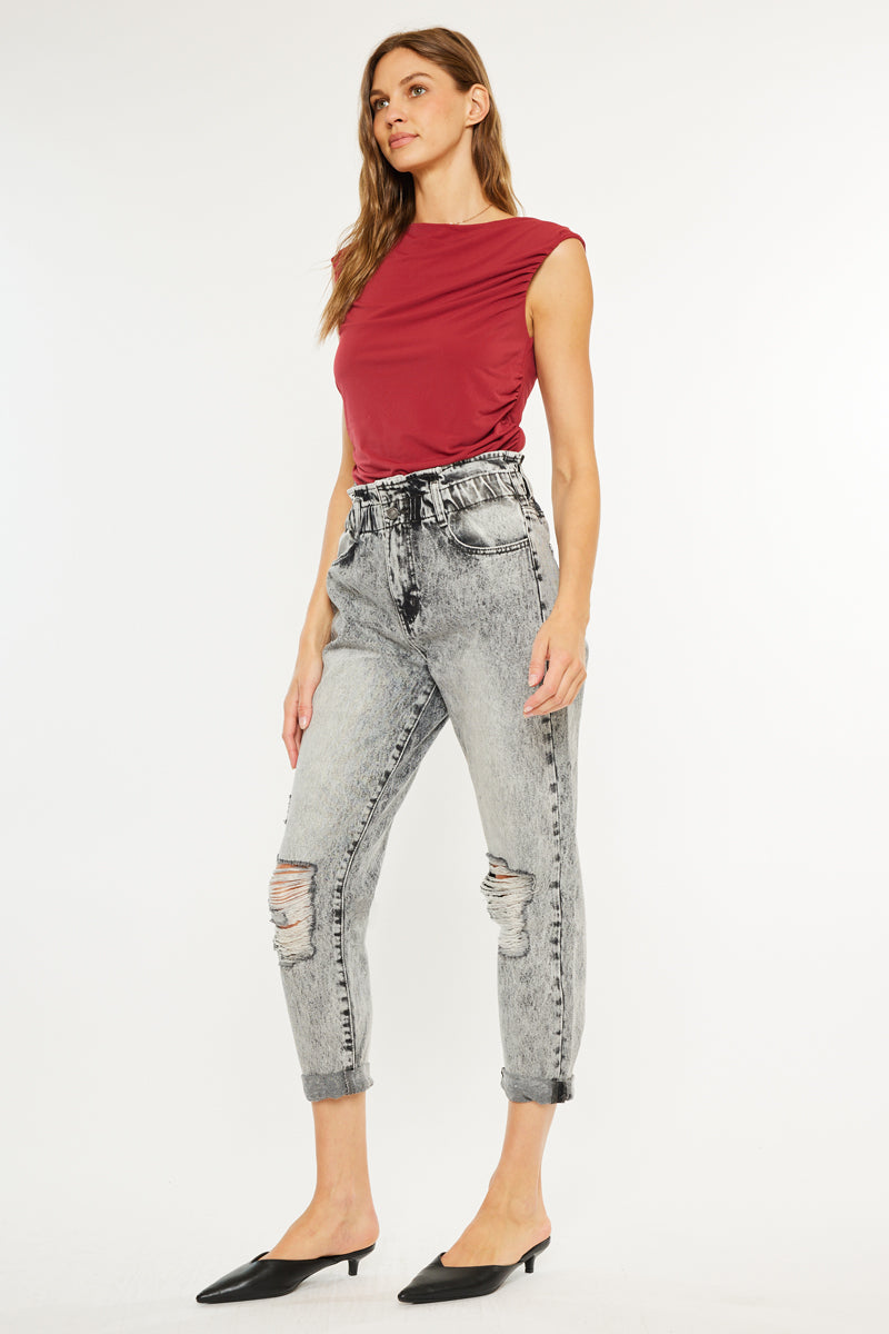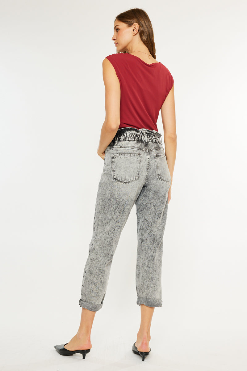 Our Akali Ultra High Rise boyfriend jeans feature an elastic paperbag waist design and elastic hem that creates a look that's both casual and chic. Sits high above the natural waistline as it relaxes down the leg and finishes at the ankle with a cuffed hem. Features a button front, zip-fly, 2 front panel pockets, and 2 back pockets.