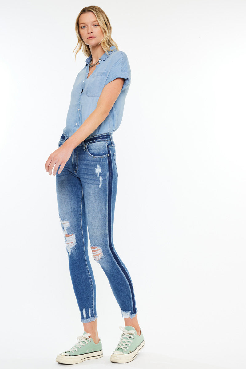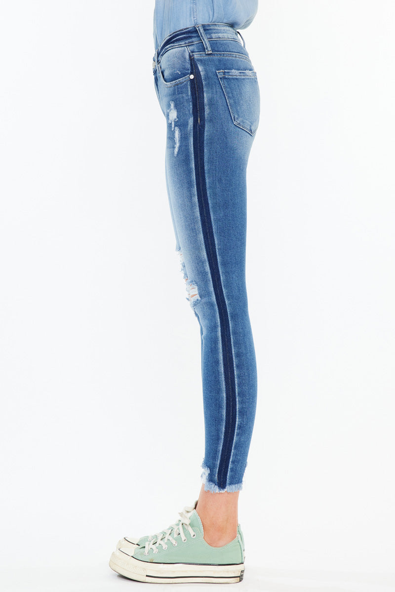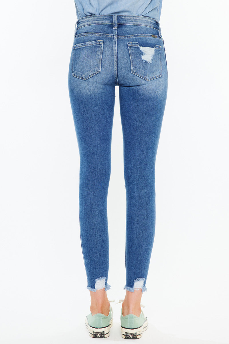 Our Alora Mid Rise Ankle Skinny jeans come in a vibrant medium blue wash with just the right amount of distress fading and whiskering detail. Sits right at the natural waistline as it tapers down the leg creating a skin-tight silhouette that enhances your figure. Made with comfortably soft stretch denim that gives you a butter-soft feel and flexible fit. Features a classic five-pocket design, single-button front, and zip-fly closure.