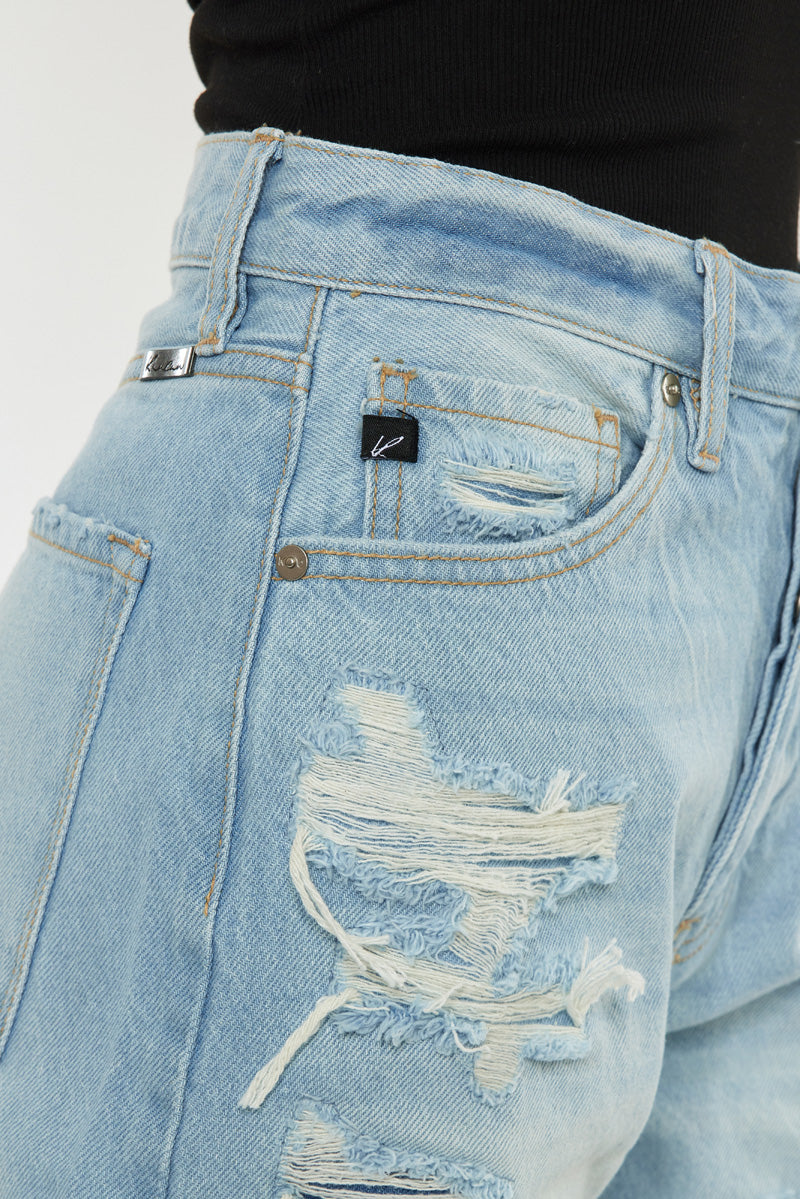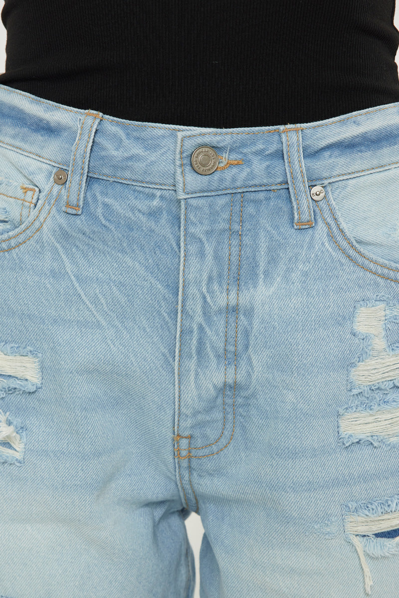Our Althaia 90's boyfriend shorts come in a light blue wash with fading on the front and back, distress detail with patches, classic 5 pocket design, and a hidden button closure. Sits right above the waist for an on-trend look that accentuates the waistline and elongates the body. Perfect for summer beach days or lounging around at home.