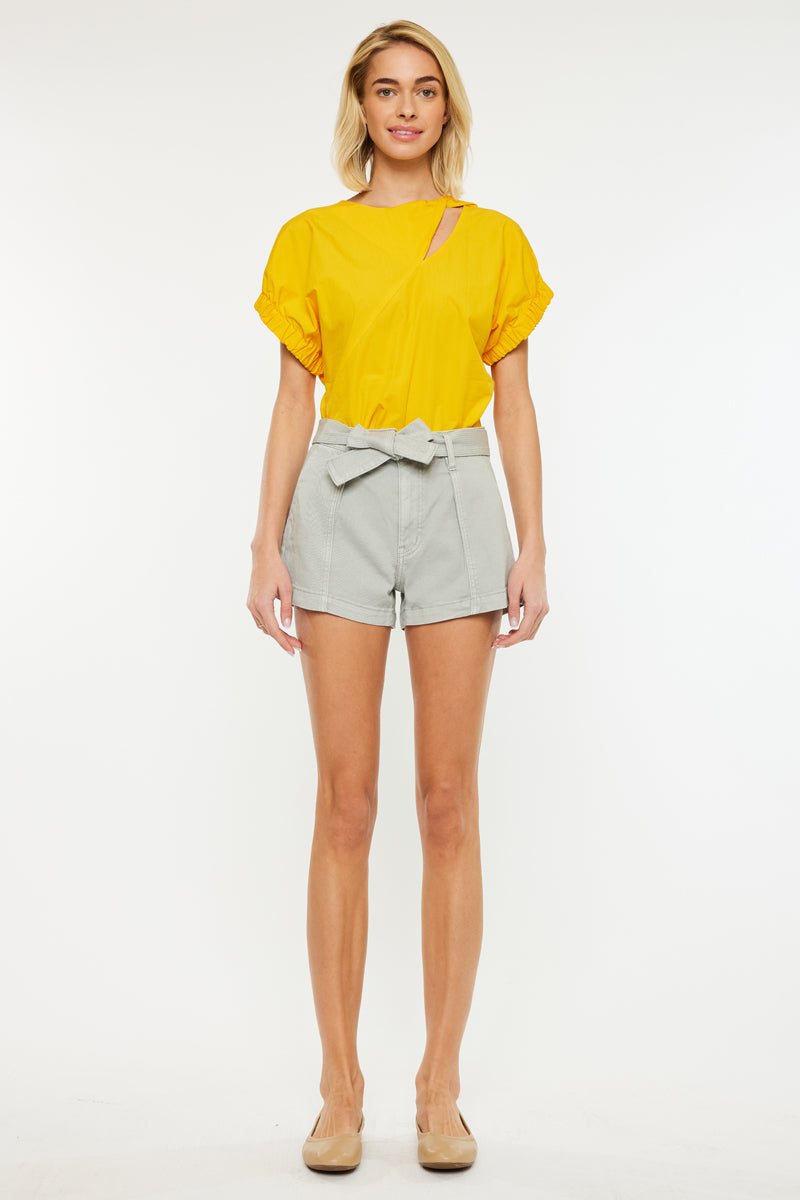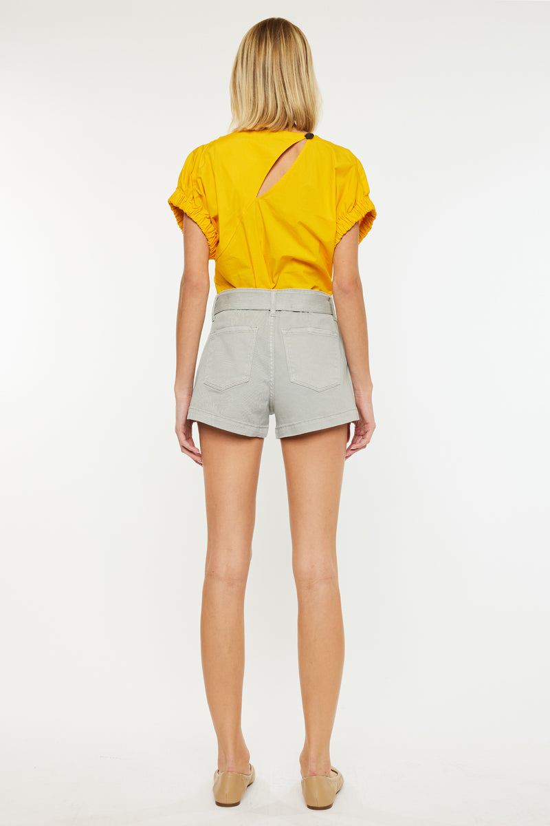 Create your next chic outfit with this pair of gray comfort stretch shorts featuring a clean hem, a matching belt, and a notched waistband. Comes in a classic short fit, 5-pocket design, and a single-button closure with a zip fly.