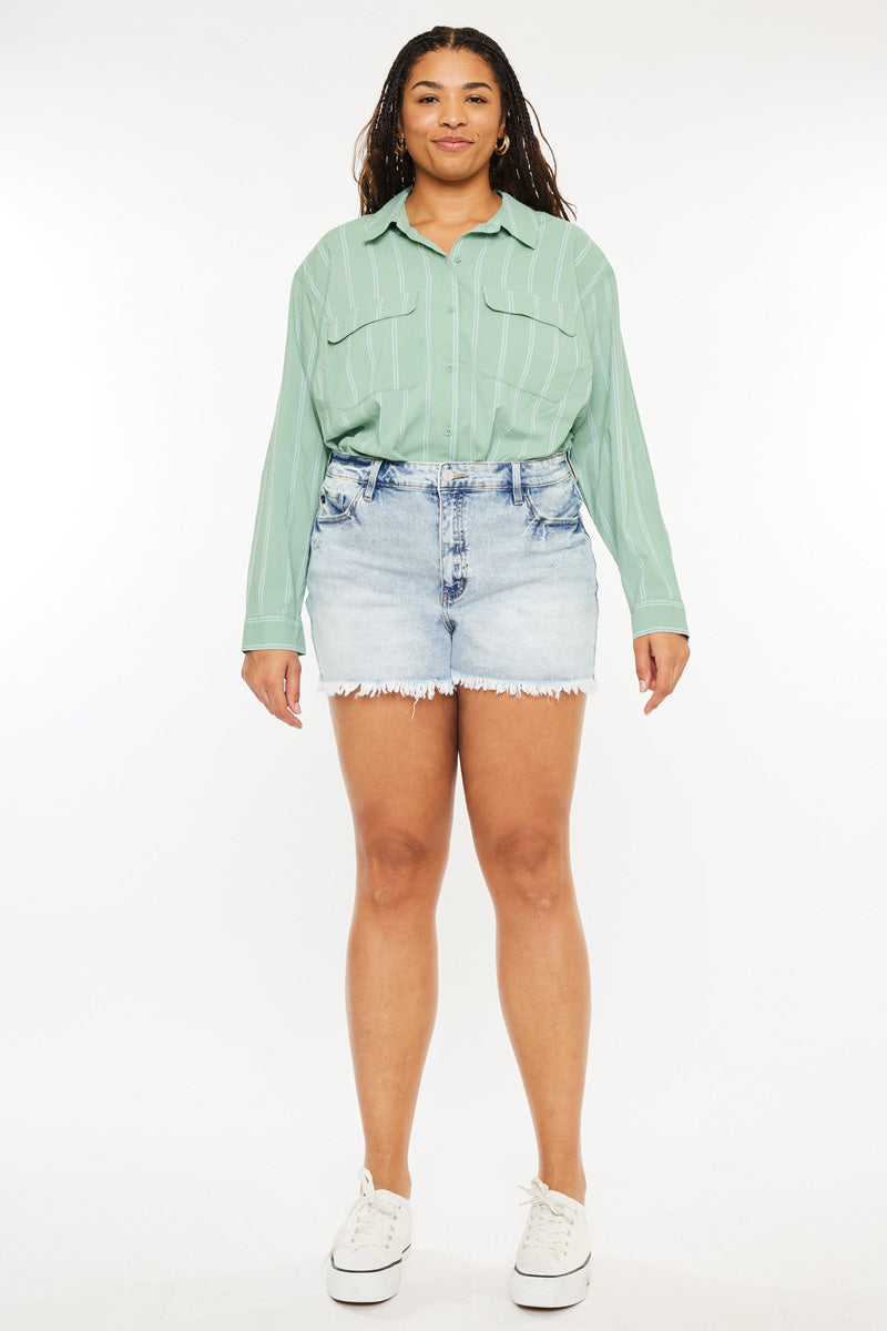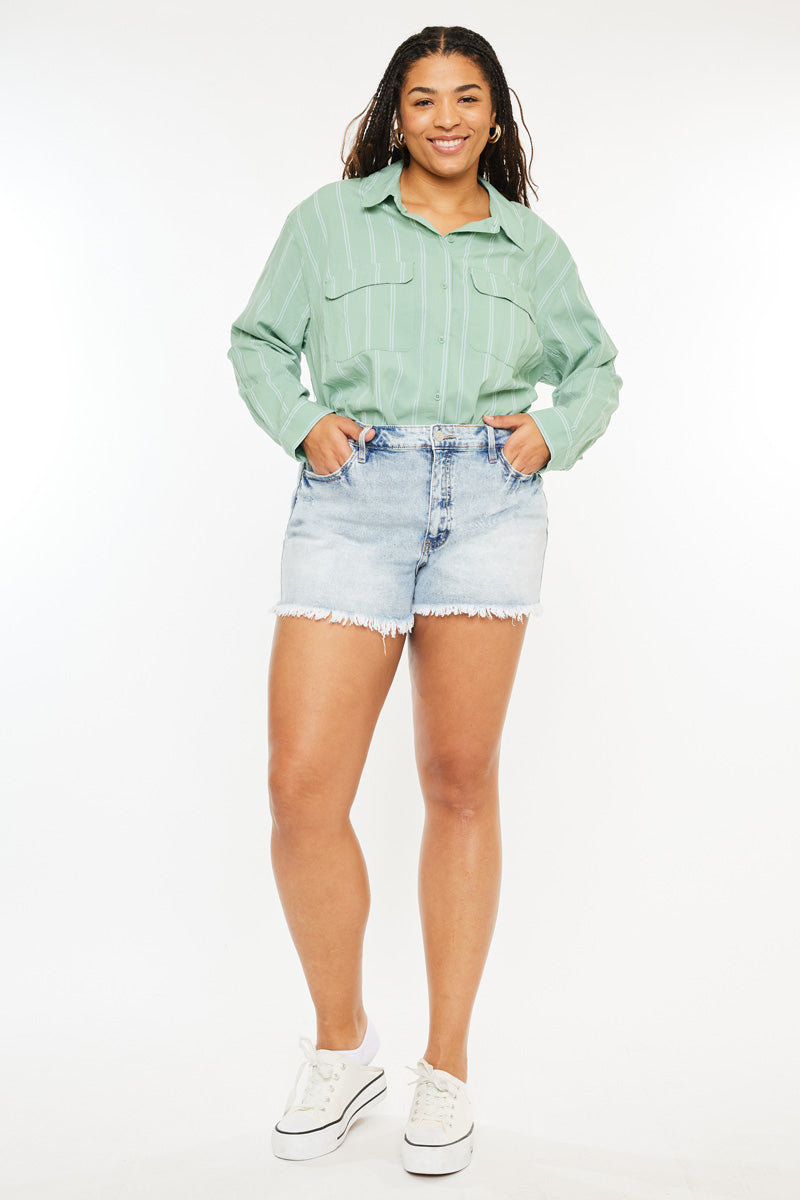 Our Anastasia Essentials High Rise Shorts comes in a light blue wash with minimal fading. Its raw hem and chic style give it an edgy vibe that's perfect for everyday wear. Pairs best with casual tees or crop tops for a comfortably stylish look.