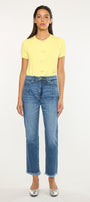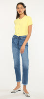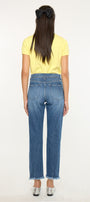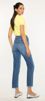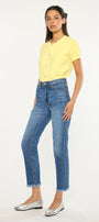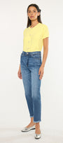 The Angelina High Rise straight slim fit is classy and trendy with its uniquely designed fringed slit hem. This slim-fit comes with fading and light distress. You can't go wrong with these beautiful medium shade blue jeans, fit for the everyday woman. This ankle jean sits just above the waist with an overall relaxed straight slim fit.