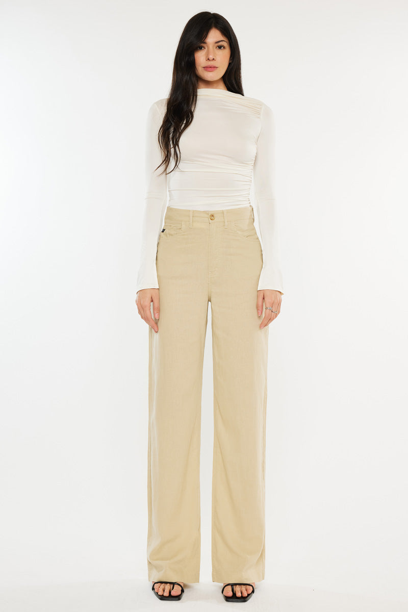 Our Annabelle pants come in a buttery soft linen blend that is ultra-thin and designed for your comfort. It features a 5 pocket design, zip fly, and a marble-like button front that's both casual and chic. This safari-style garment sits high above the natural waistline as it relaxes down the leg in a wide straight-leg fit and finishes at the hems in a beautiful taupe-like color. This style is classy, sleek, and safari chic, the perfect addition to any closet and finishes at the ankle with a double folded hem. Features a wooden button front, zip-fly, 2 front panel pockets, and 2 back pockets.