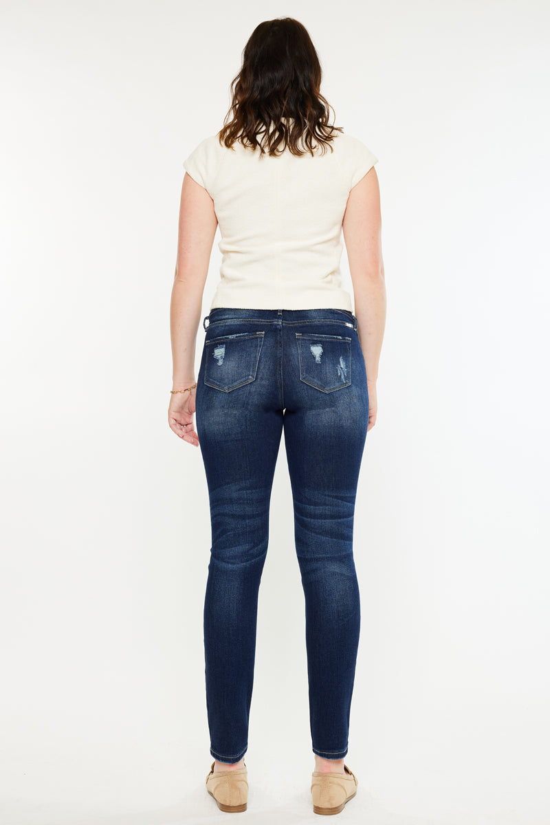 A dark-washed maternity jean featuring a full stretch waistband. Features slight fading, whiskering, and a classic super skinny fit that will keep you stylish even through your third trimester. Comes in a 5.5" rise and is made with soft, stretch denim for a comfortable and breathable design. Features a classic five-pocket design and sealed closure for easy pull-up wear. Finished with gold-colored hardware.