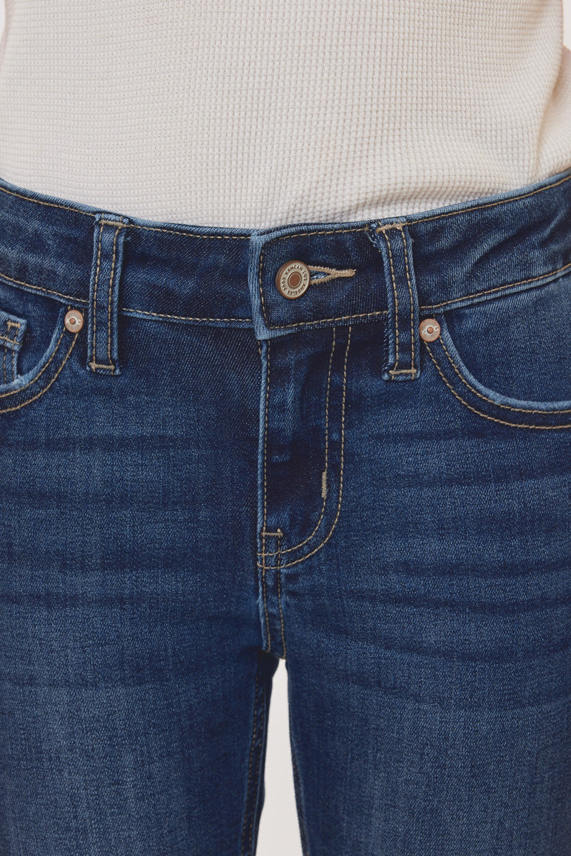 Our Aster Mid Rise Flare Kid Jeans are a classic flare look that rises right at the hip and flares out at the bottom. Comes in two shades a Dark Wash and a Medium Wash with mild fading and whiskering. Features a 5-pocket style, single front button closure, and zip fly.