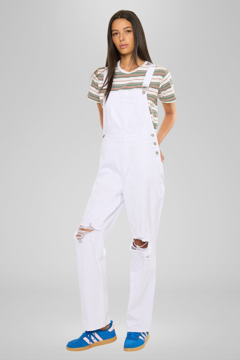 For those who like to get their hands dirty or simply love the cottage core style. Our Becky 90's Overalls is made with our durable non-stretch denim that comes in white and light wash. This classic workwear is an update to your usual jeans and t-shirt that gets better with age and wear throughout the seasons. Features a relaxed fit through the legs, medium distress, a front patched pocket, and a regular hem.