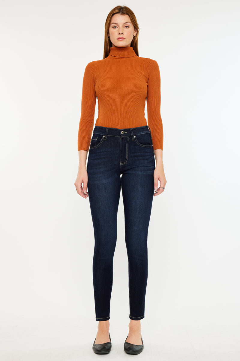 Stretch denim with minor whiskering and contrast stitching for a sleek, super skinny fit. Our Bennie High Rise Super Skinny Jean sits just above the natural waistline as it tapers down the leg creating a fitted silhouette for a flattering fit. Comes with optimal stretch allowing you to move freely without feeling uncomfortable. Features a classic five-pocket design, single-button front, and zip-fly closure.