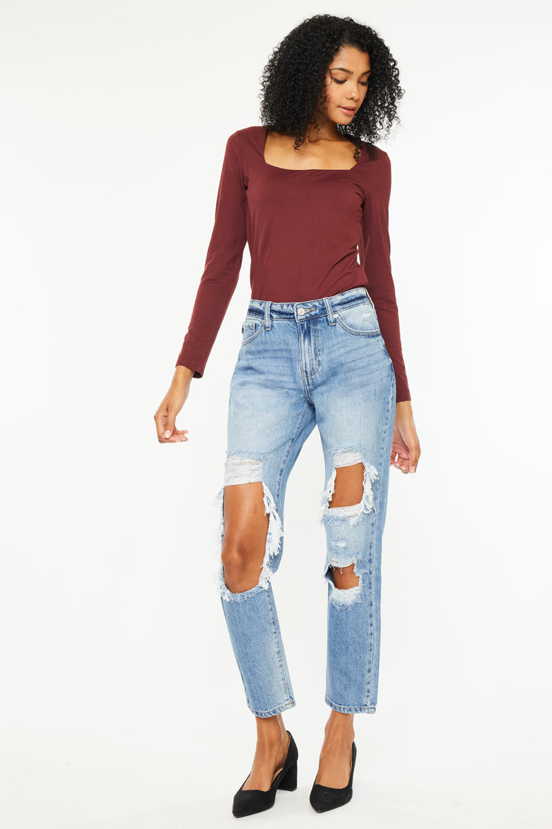 Medium-washed non-stretch bonnie high rise boyfriend jeans. Featuring heavy distresses, roomy baggy fit, subtle tattered detail, mild fading, and whiskering.