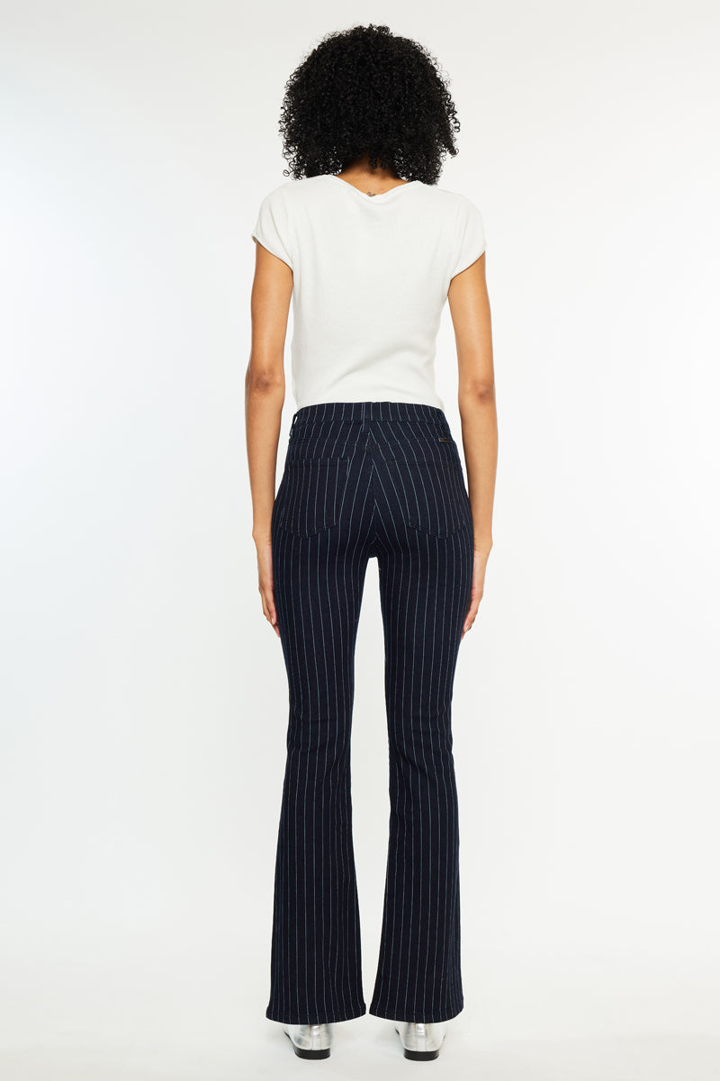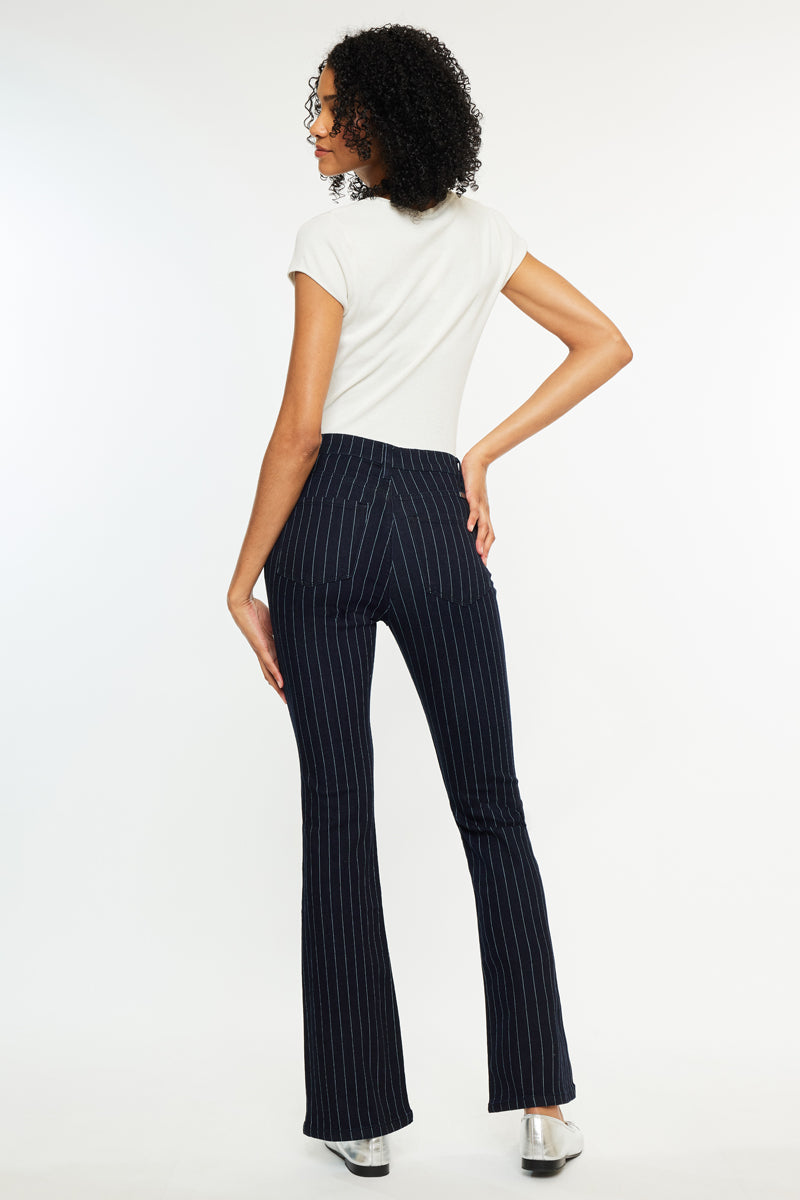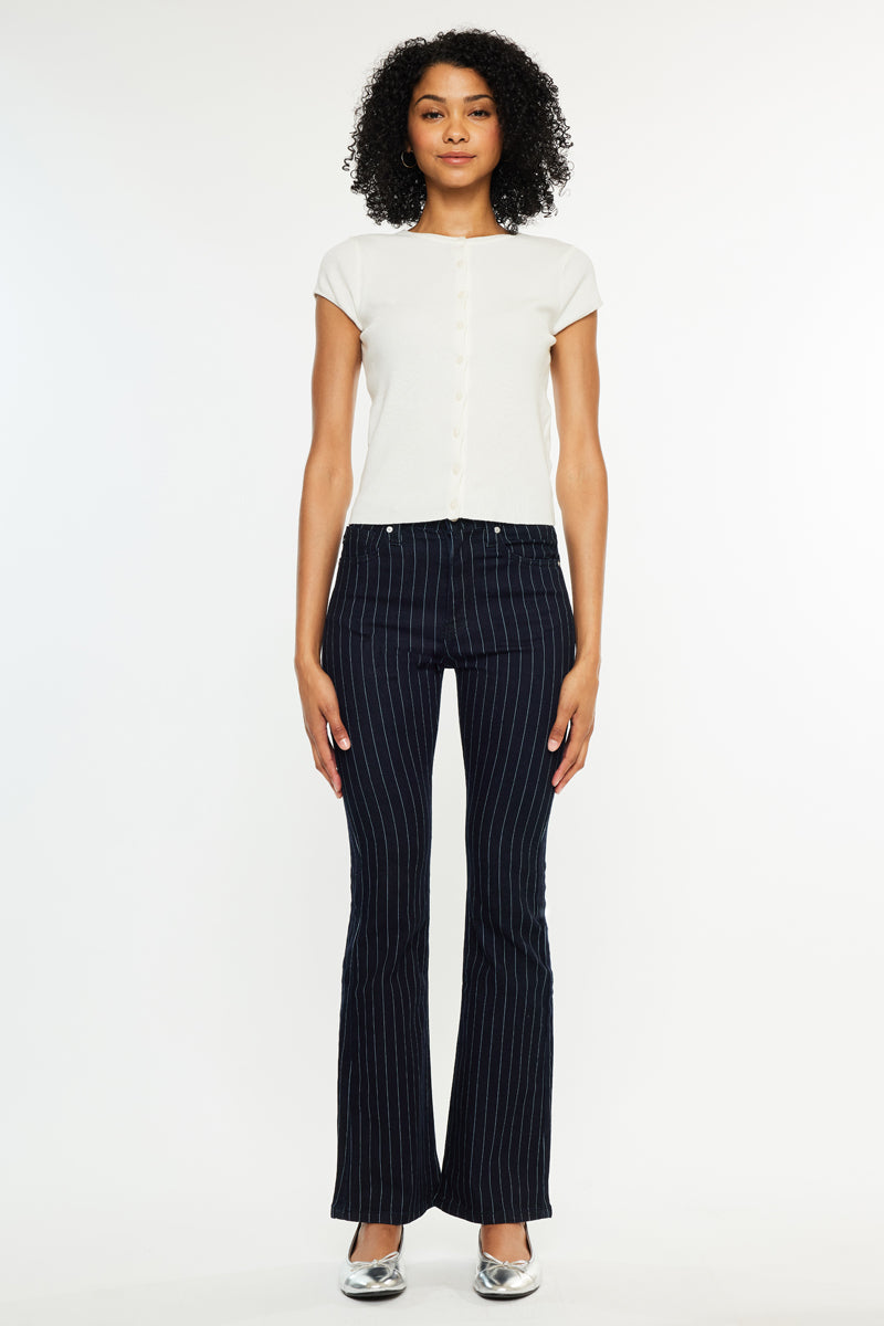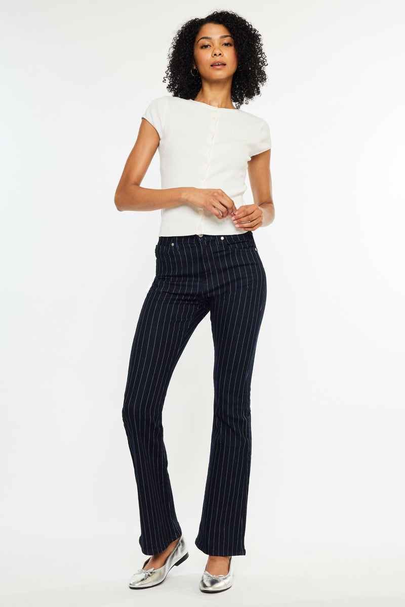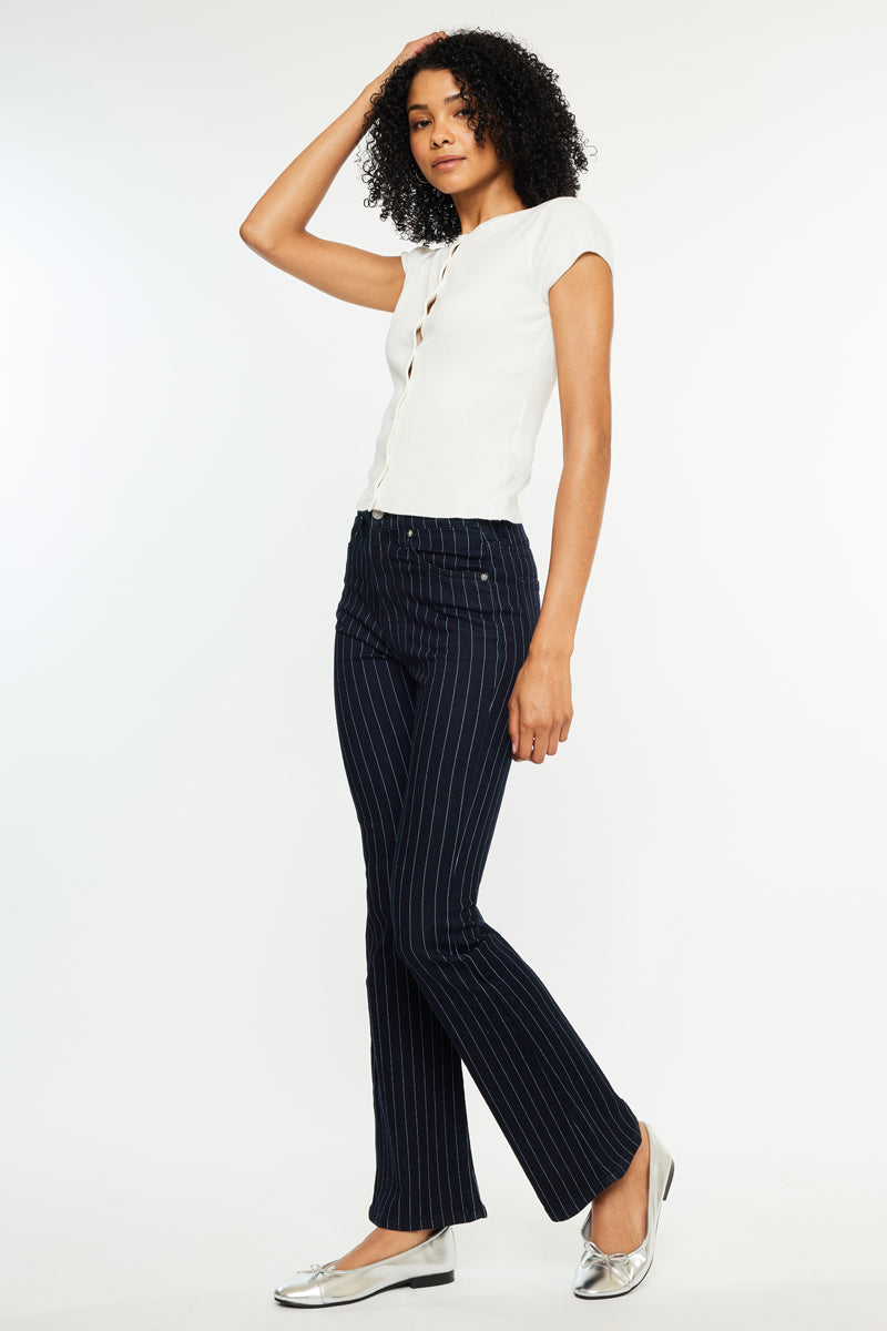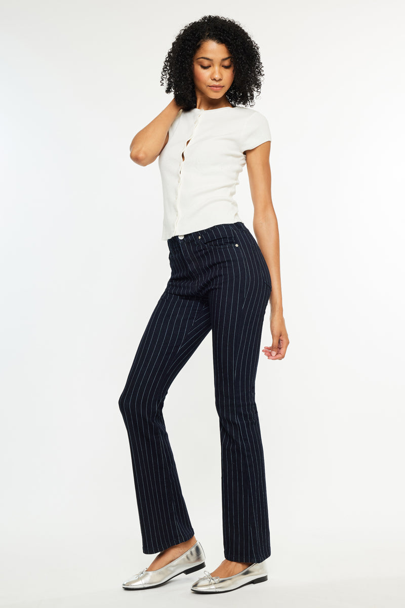 Brandie High Rise Bootcut Jeans (Petite) are a sophisticated style, in a dark blue color with stripes. Wear this style for any occasion and be guaranteed to stand out. This soft denim has a regular hem, the classic single button closure, zip fly and 5-pockets.