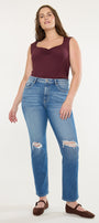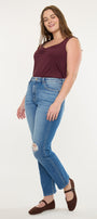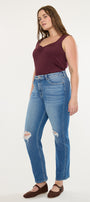 Looking for a pair of pants that look good with your shirt tucked or with a cropped tank? You can't go wrong with our Buni High Rise Slim Straight Jeans for your next pair of straight jeans. It's a classic slim straight fit that comes in a beautiful medium wash. Sits just above the natural waistline; This fits snug from hip to thigh and it relaxes from knee to leg. Made with our ultra soft stretch denim that stays comfortable and breathable throughout the day. Features distressed at the knees, the classic 5-pocket style and single button zip fly closure.