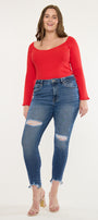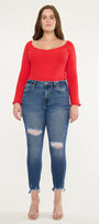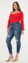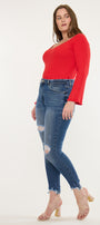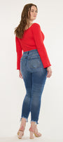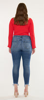 Blue hues come together to form this beautiful faded dark wash 1 button-fly ankle skinny jeans. Featuring small distress and fray hem detail for an edgy yet glamorous feel. A comfortable and classic fit perfect for any occasion.