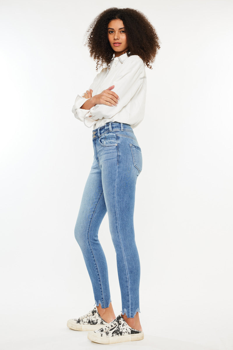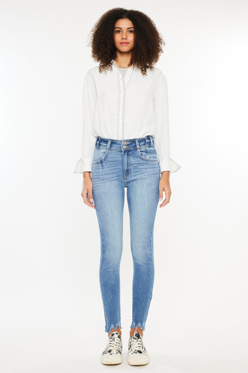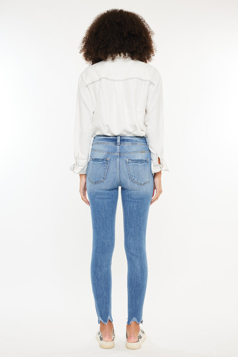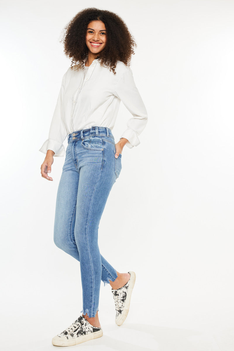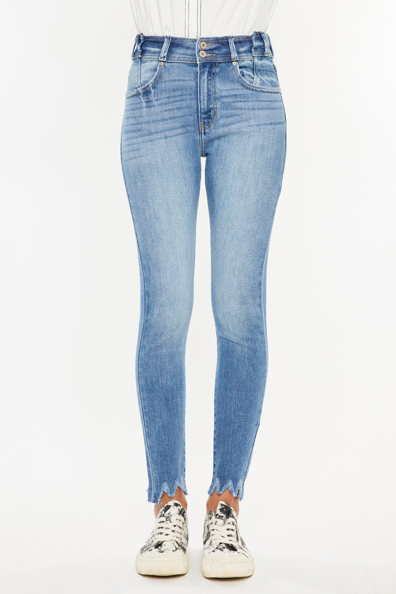 Our Candy High Rise Super Skinny jeans in a Medium Wash. These jeans are crafted with a stretchable fabric that ensures a comfortable and flattering fit. The super skinny silhouette accentuates the curves and contours of the body, while the high rise design provides ample coverage and support. The frayed hem adds a touch of edginess to the overall look, making it a perfect choice for a casual yet stylish outfit. These jeans are versatile and can be paired with a variety of tops and accessories to create a range of looks. Invest in these High Rise Super Skinny jeans for a wardrobe staple that will elevate your style game.