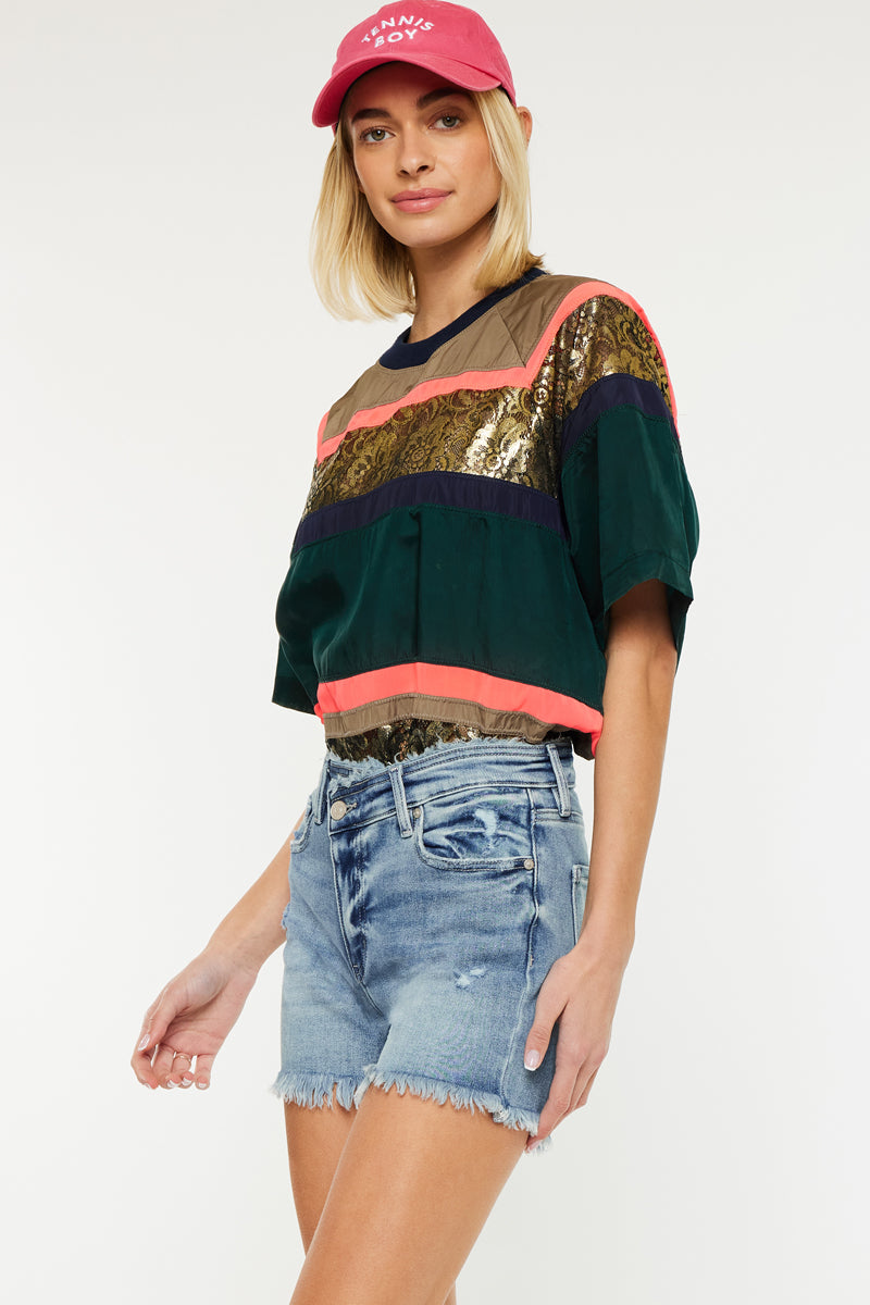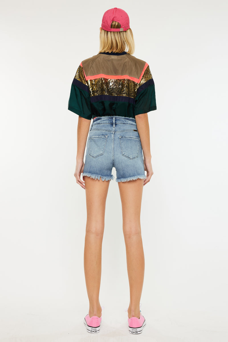 Carnelia High Rise Shorts come in a stunning Medium wash color. A crossover waistband with contrasting details around the front of the shorts. One button closure with a zipper fly and 5-pocket style.