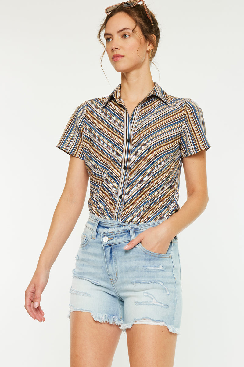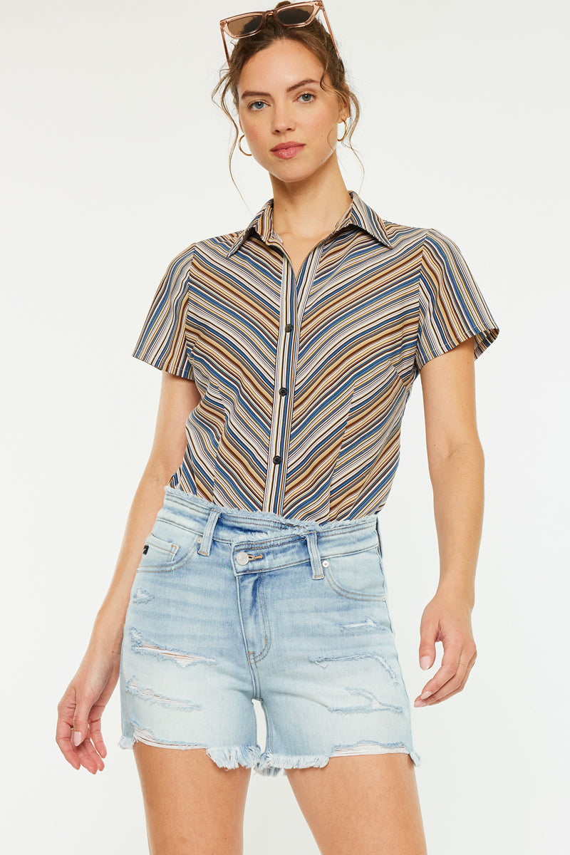 This pair of light wash shorts creates a cute, boho-chic look, making it a fun addition to your warm-weather wardrobe! Create a figure-flattering look and ease of styling with a range of tops! Featuring a high-rise fit that cinch and accentuates your waist, frayed hem, cross over waistband, 5-pocket design, and a single button front closure with zip fly.