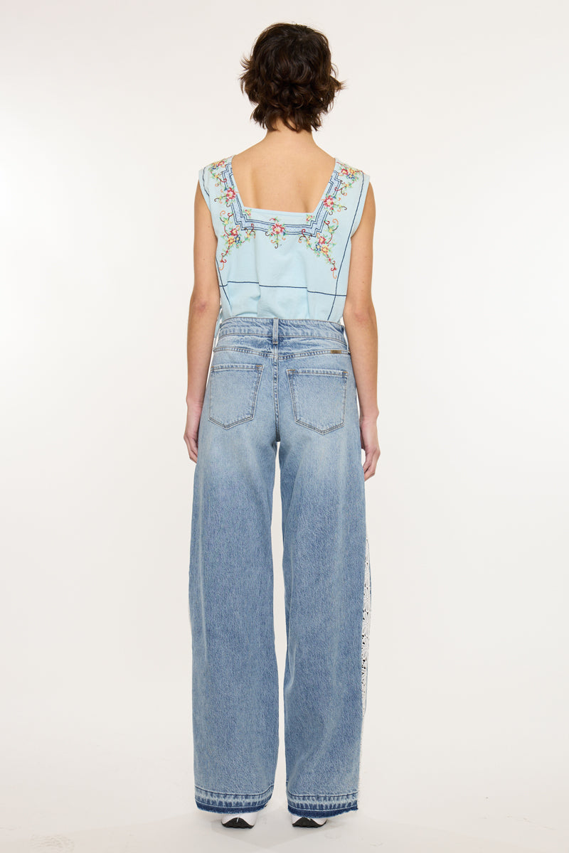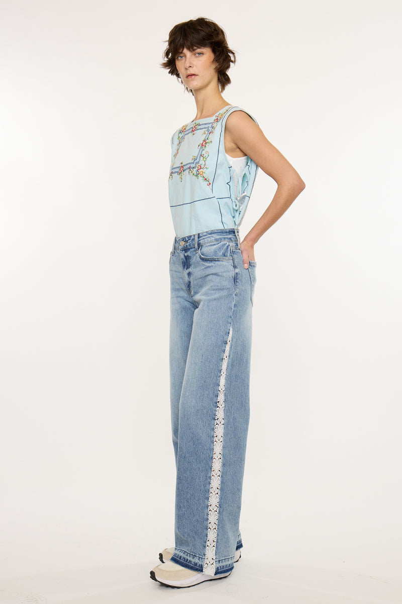 In a new flare we have our Carollyn High Rise Wide. This wide style in a medium wash color with lace details. Down the side seam we have lace trim that blends out perfectly with the flare. This style is perfect for everyday wear for errands or a night out! Features single button closure, zipper fly, and 5-pockets.