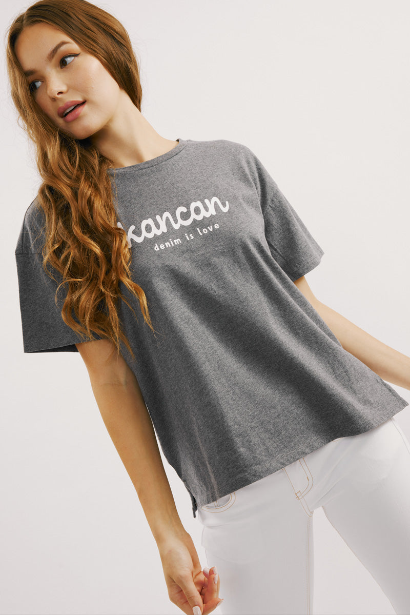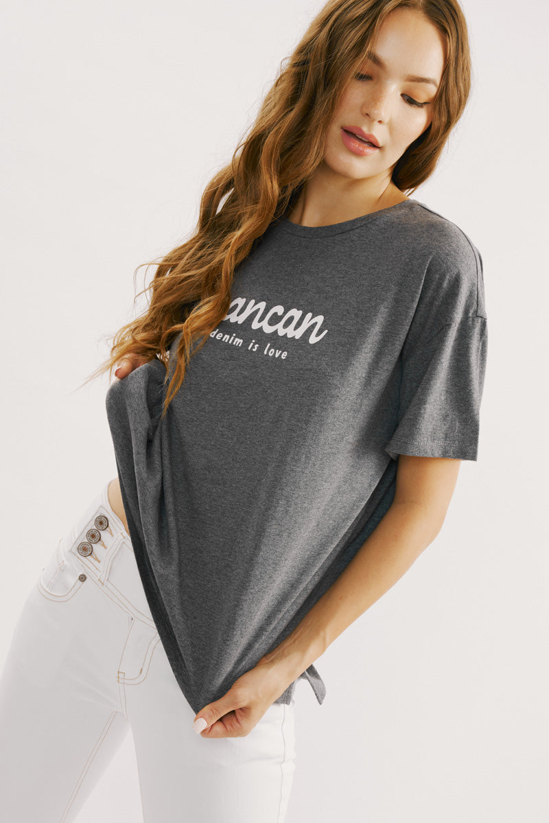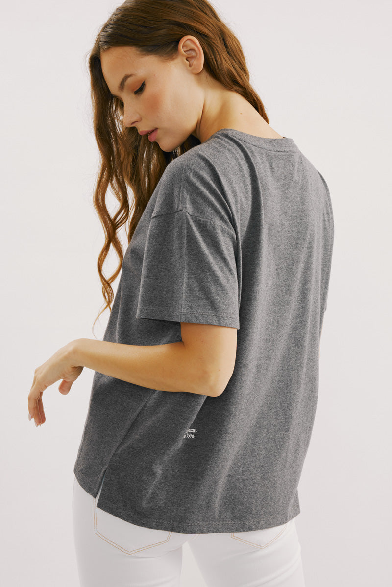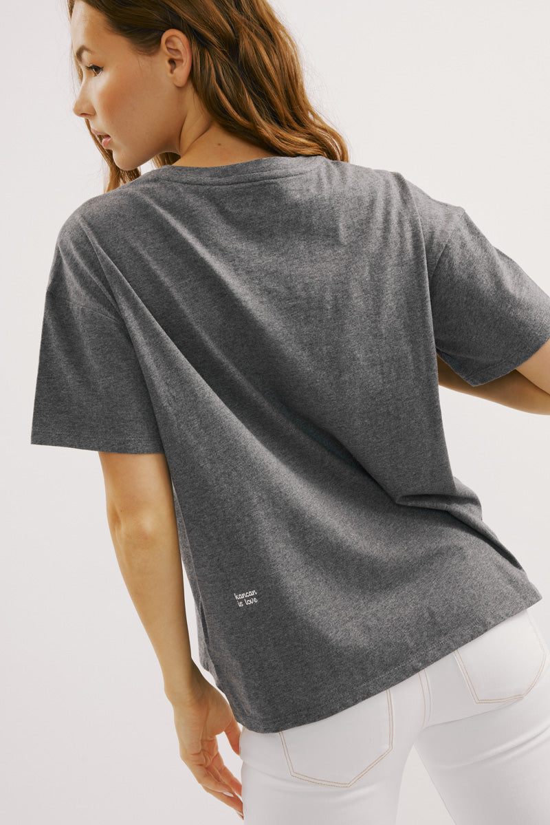 Our Casey Boyfriend Shirt comes in a comfortable and loose fit made with our super soft fabric. Comes in heather gray color with a white printed text design on the front and the bottom back.