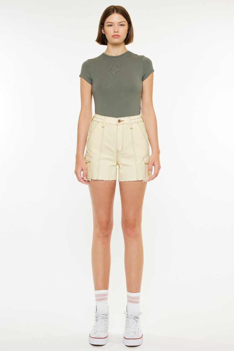 Our Cassie High Rise shorts are mix between style and comfortability. Designed in an Ecru color they are a must-have for your summer wardrobe. Made with rigid denim for a not-too-stiff fit that's comfortable and won't bag out. Featuring an elastic waistband, two side slant pockets with patch pockets a button closure with a zip fly.