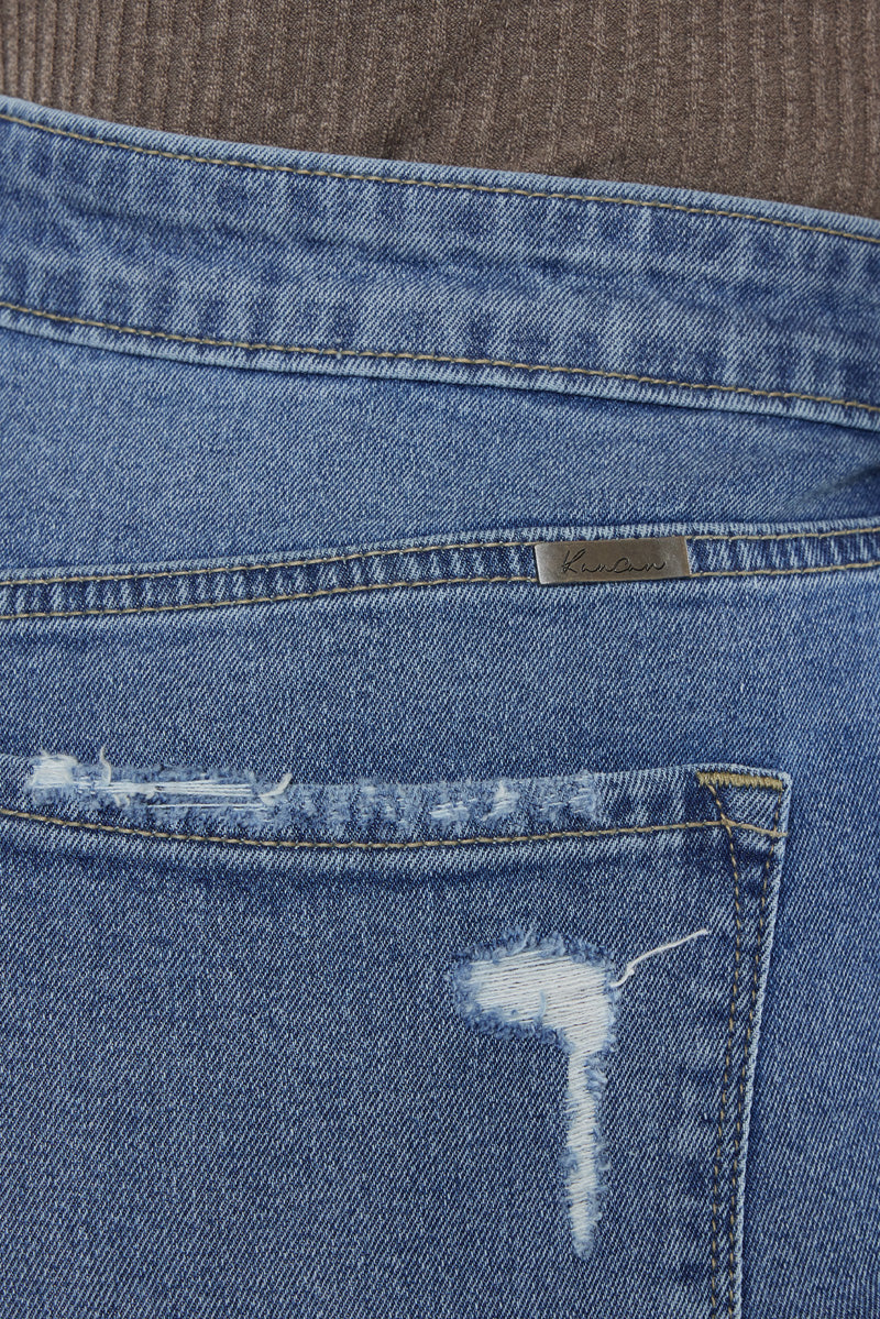 The Cassiel High Rise Slim Wide Leg Jeans are the perfect style to show off your personality! Sits above the waist and relaxes down the leg to a slim-wide fit and a frayed hem. Comes in a medium wash with light fading and whiskering. Features a 5-pocket style, light distress detail, single front button closure, and zip fly.