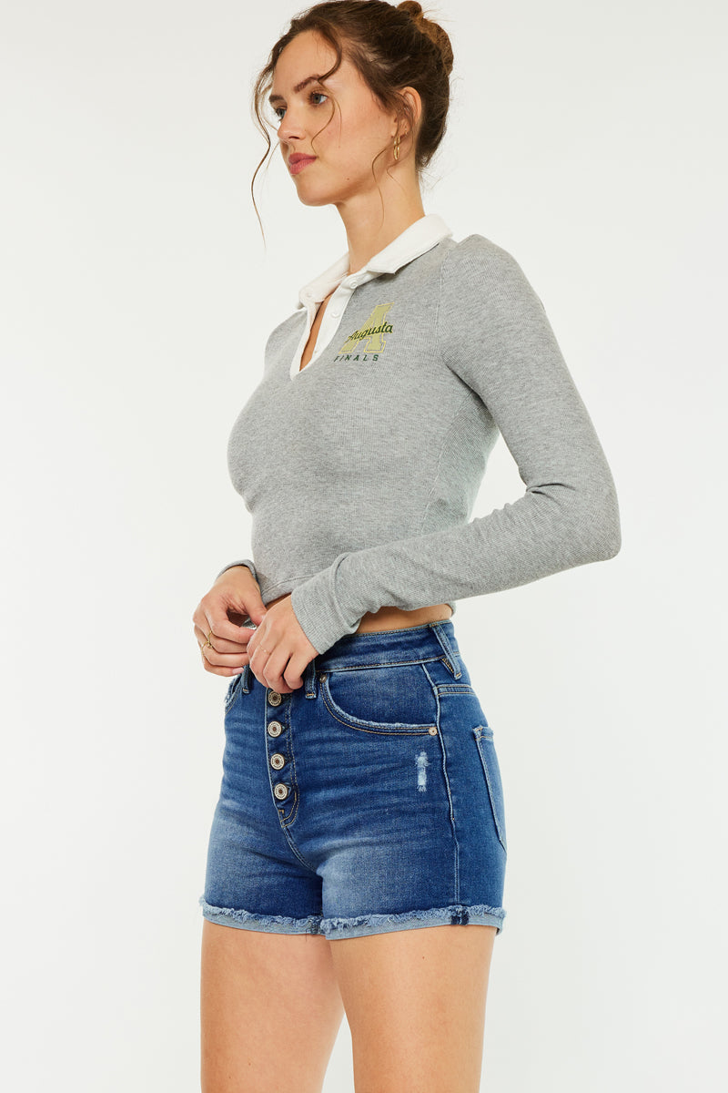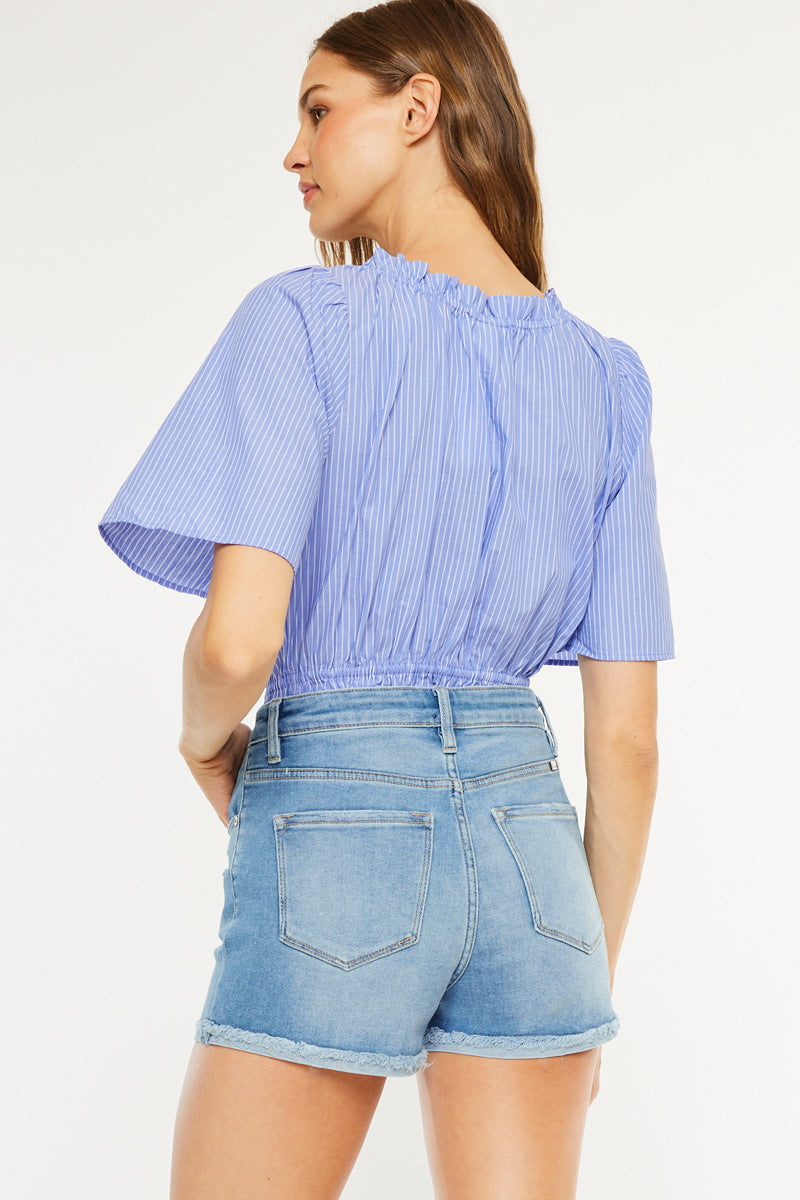 Create your own summer look with our Castile ultra-high waist denim shorts featuring a frayed folded hem that complements its light blue hue. This style features whiskering, fading, a 5-pocket design, and a 5-button front closure.