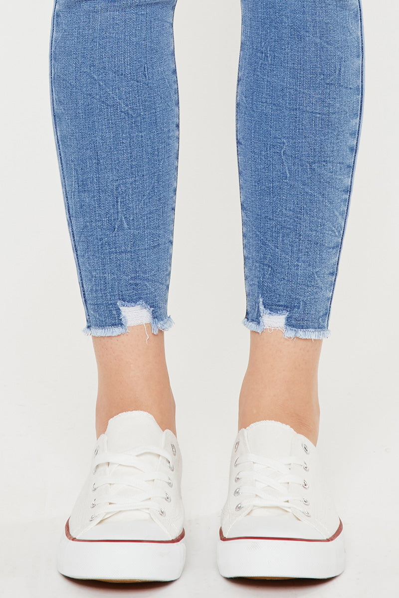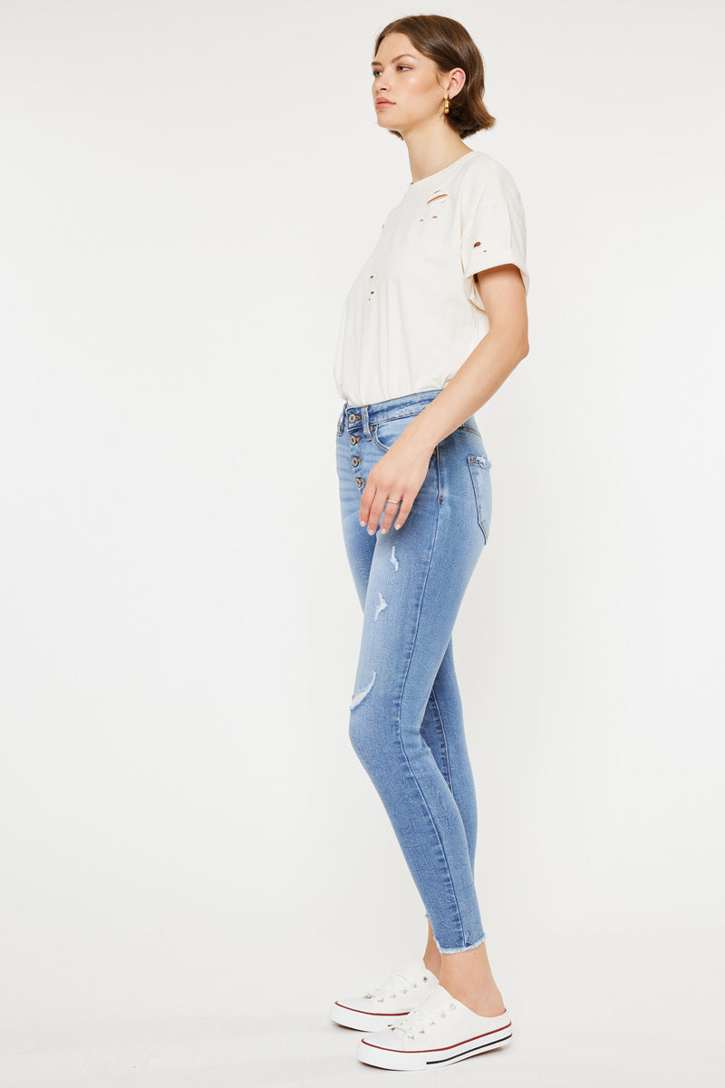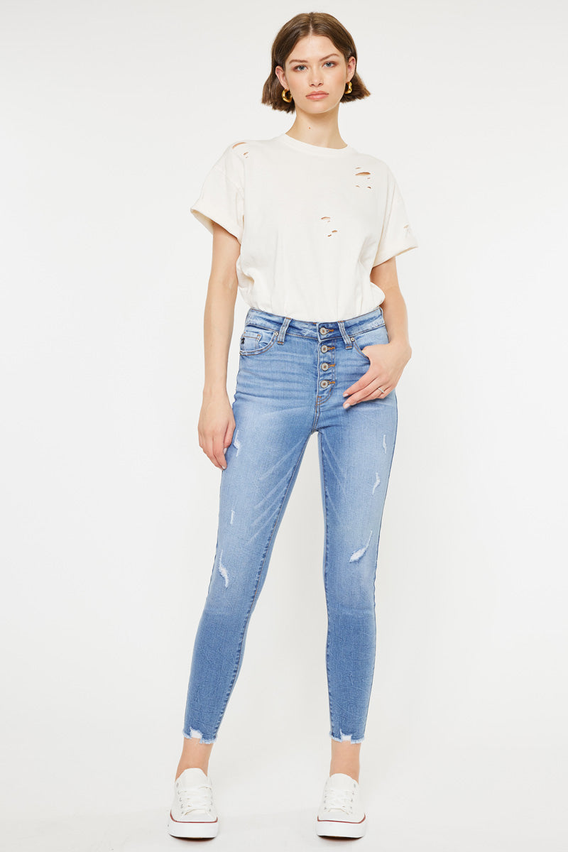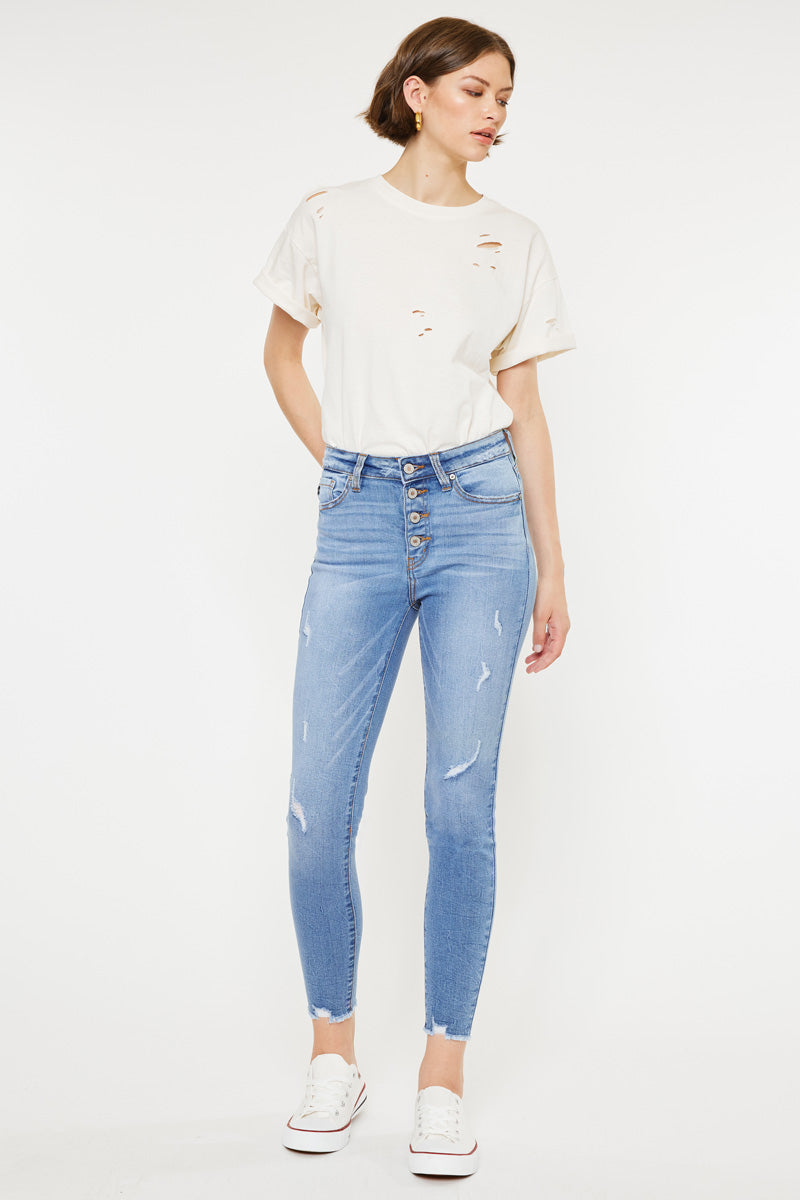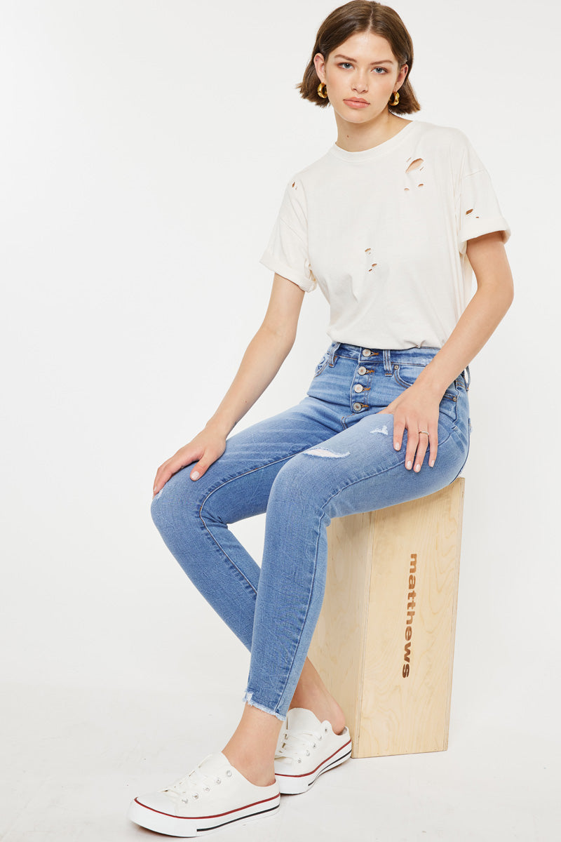Our Cecilia jeans come in a classic skinny jean fit featuring fading, whiskering, distress detail, and a soft medium blue wash. It comes with a raw staggered hem with subtle distress and fray detail that gives it a more rugged chic look. Sits just above the natural waistline as it tapers down the leg creating a figure-flattering silhouette that's perfect for dressing up or down. Made with smooth stretch denim that allows you to move with ease without bagging out after each wear. Features a classic five-pocket design, and a 4-button closure