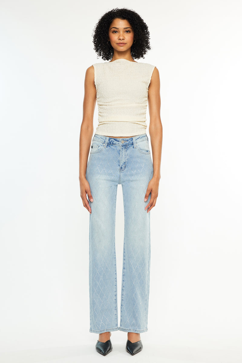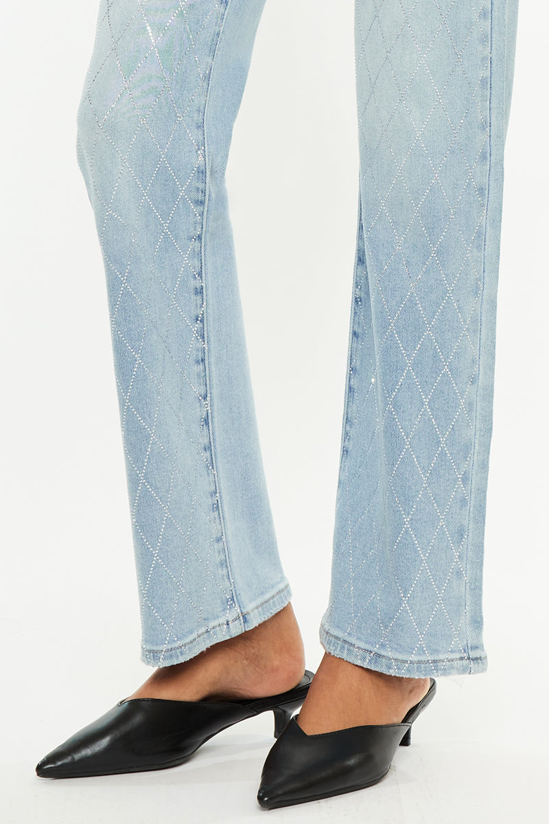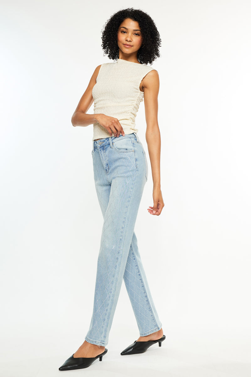 Cherise High Rise Straight Jeans in a light wash with rhinestone diamond details throughout the front. The rhinestones allow the denim to stand out while maintaining its classic straight fit. Features a regular single button closure, zip fly, and a regular hem.