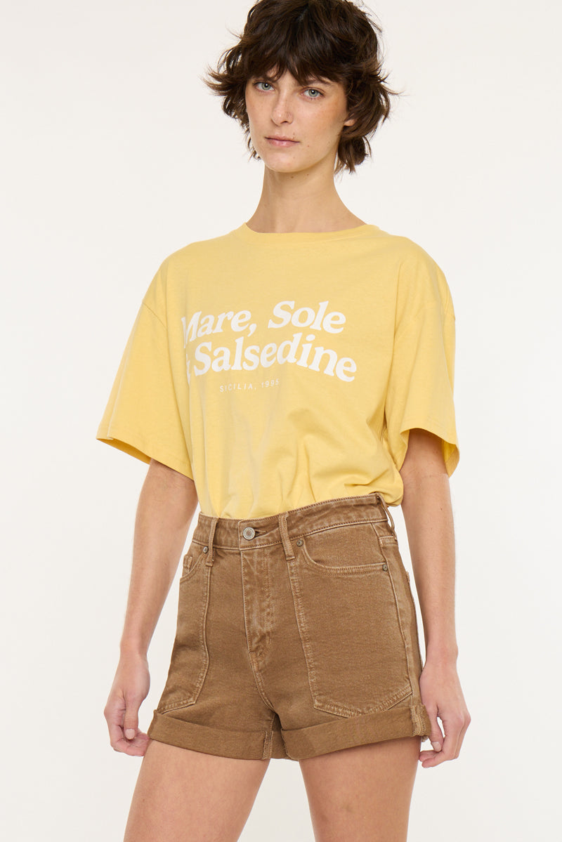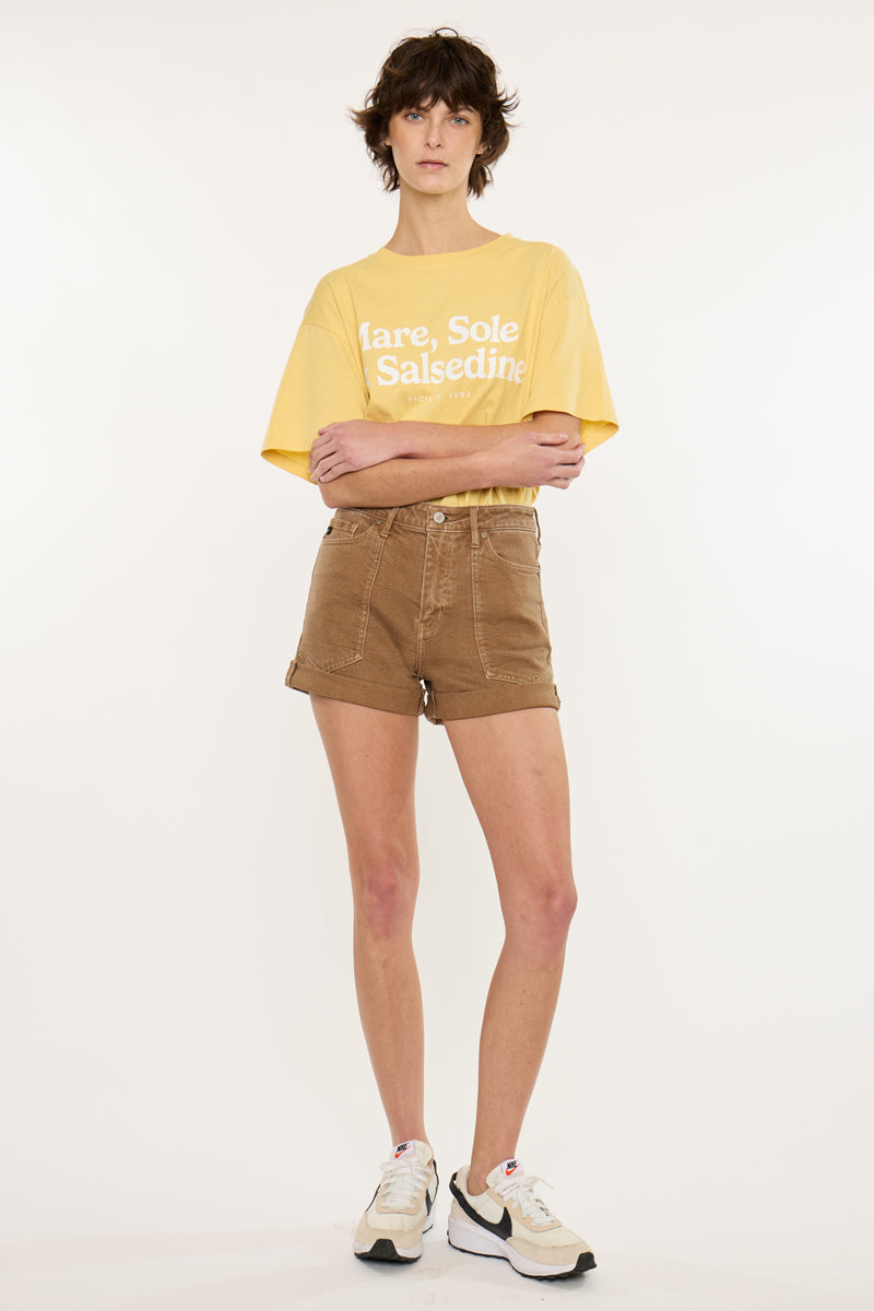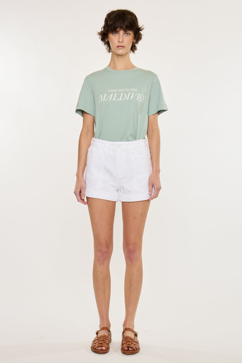 Clara High Rise mom shorts come in two different color styles. A beautiful mocha color and a classic white color. These shorts are meant to end half-way through the thigh with a folded hem. Made from a soft denim fabric meant to fit tight while also giving you the freedom to move around with ease. Features a single button closure, side cargo pockets, 5-classic pockets.