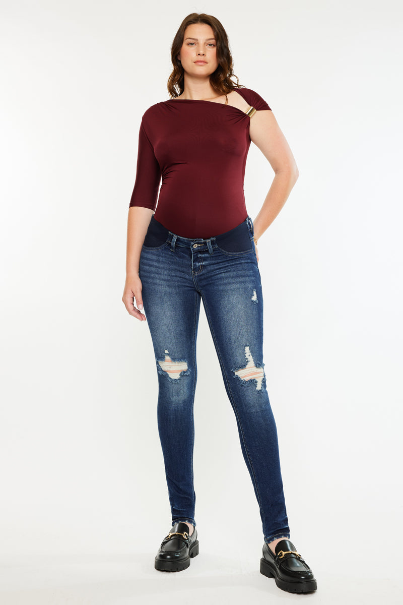 You don't have to compromise style for comfort with this stylish yet comfy dark wash maternity super skinny with distressed detailing at the knees! Featuring extra stretch denim which sculpts and shapes while adjusting to your changing body. Elastic panels at the waistband fit comfortably throughout and after pregnancy, and the functional fly makes it easy to style just like your regular jeans.