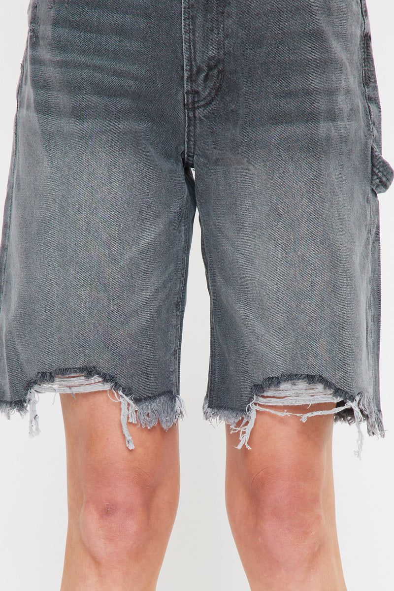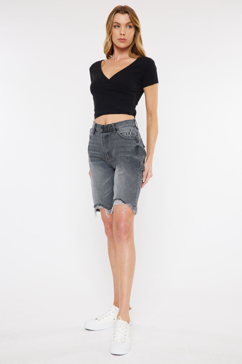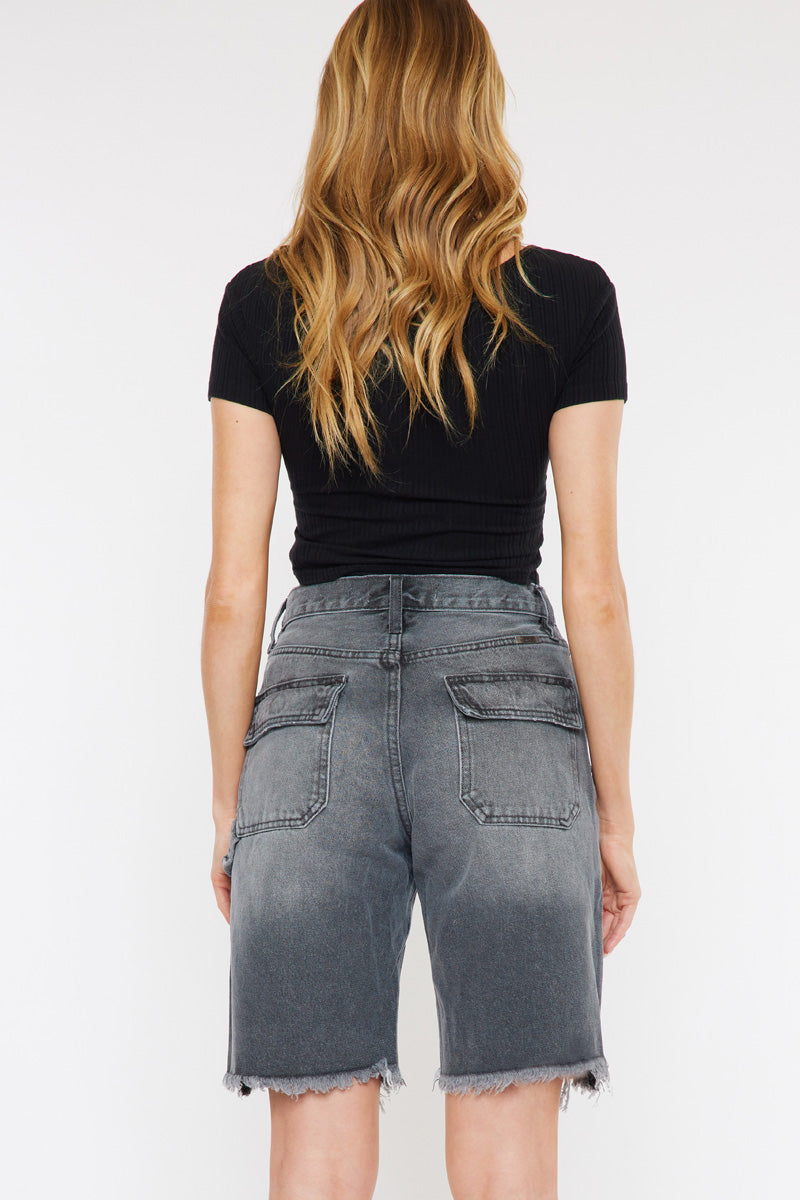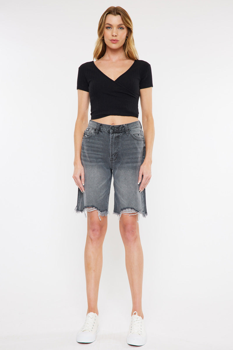 These faded gray-washed 90's Bermuda shorts feature a destructed hem with distress details, fading, and light whiskering. Its style is a classic 90's fit that is a more relaxed fit for that extra beachy vibe. Sitting above the waist with an ultra high-rise fit and traditional five-pockets, it's a refreshing take on a classic short design.