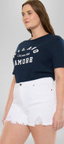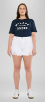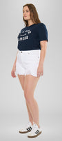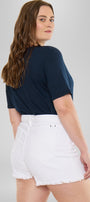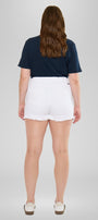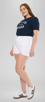 Our Cleo High Rise Shorts is perfect for Summer. Get comfortable in our stretch white color denim that accentuates your curves and is great for everyday wear. Features a fun frayed hem, a single button, optic white color, and distress!