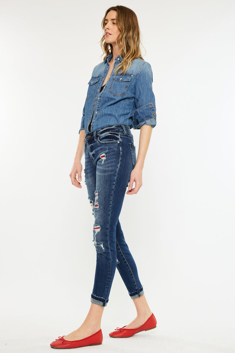 Our Coco Mid Rise Jeans come in an ankle skinny cut with distressed details and plaid patches. Sits right at the natural waistline as it tapers down the leg creating a classic skinny jean silhouette that'll hug your every curve. Made with buttery-soft stretch denim that's flexible, breathable, and durable. Features a classic five-pocket design, single-button front, and zip-fly closure.