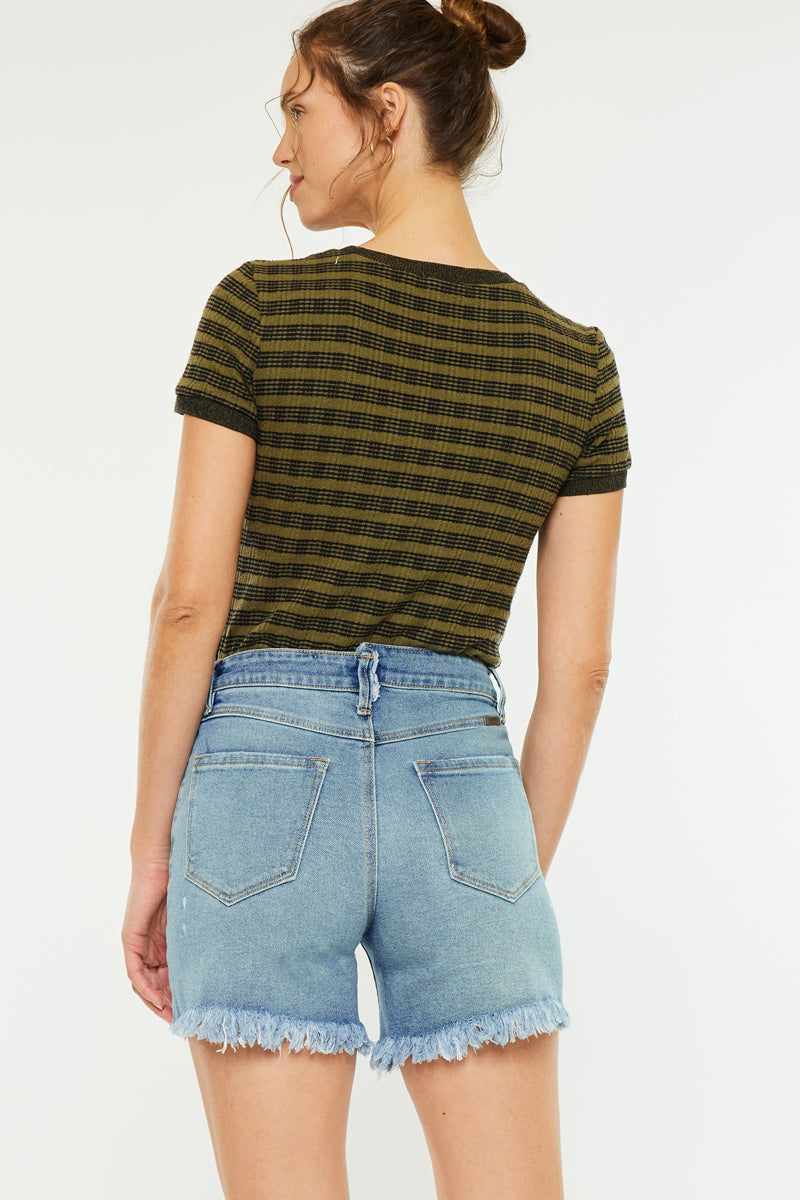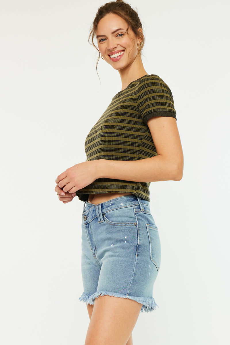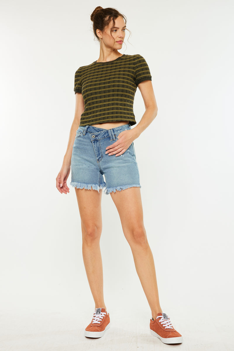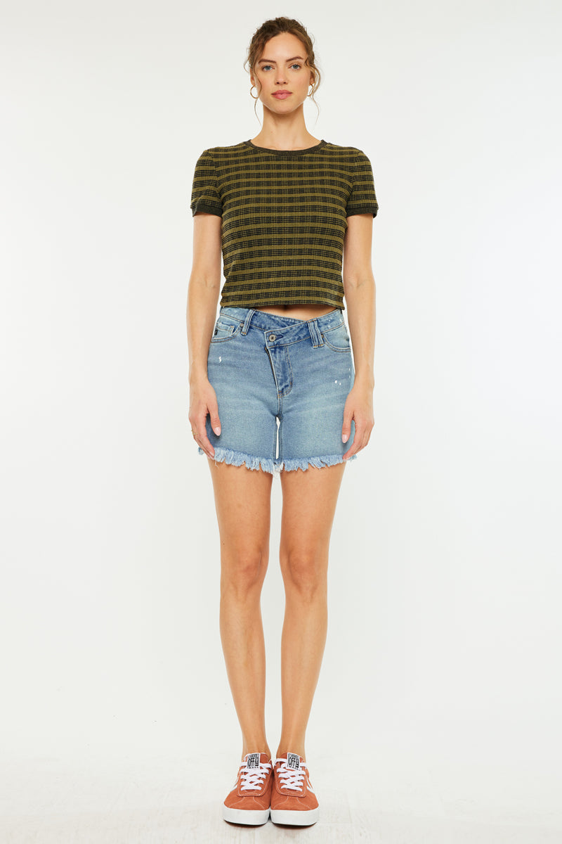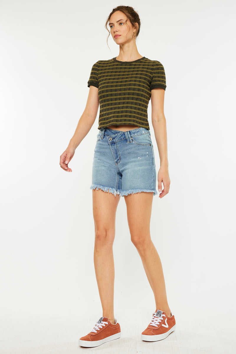 Our Dahana High-Rise Shorts is a unique easy-to-wear style piece. Comes in a medium wash with minimal white splatter design, these shorts sit above the waist and relaxes down your thigh to a frayed hem. Show off your waist with its unique cross-over waistband design and made with our comfort stretch denim that won't bag out after multiple washes. Features a 5-pocket style, single front button closure, and zip fly.