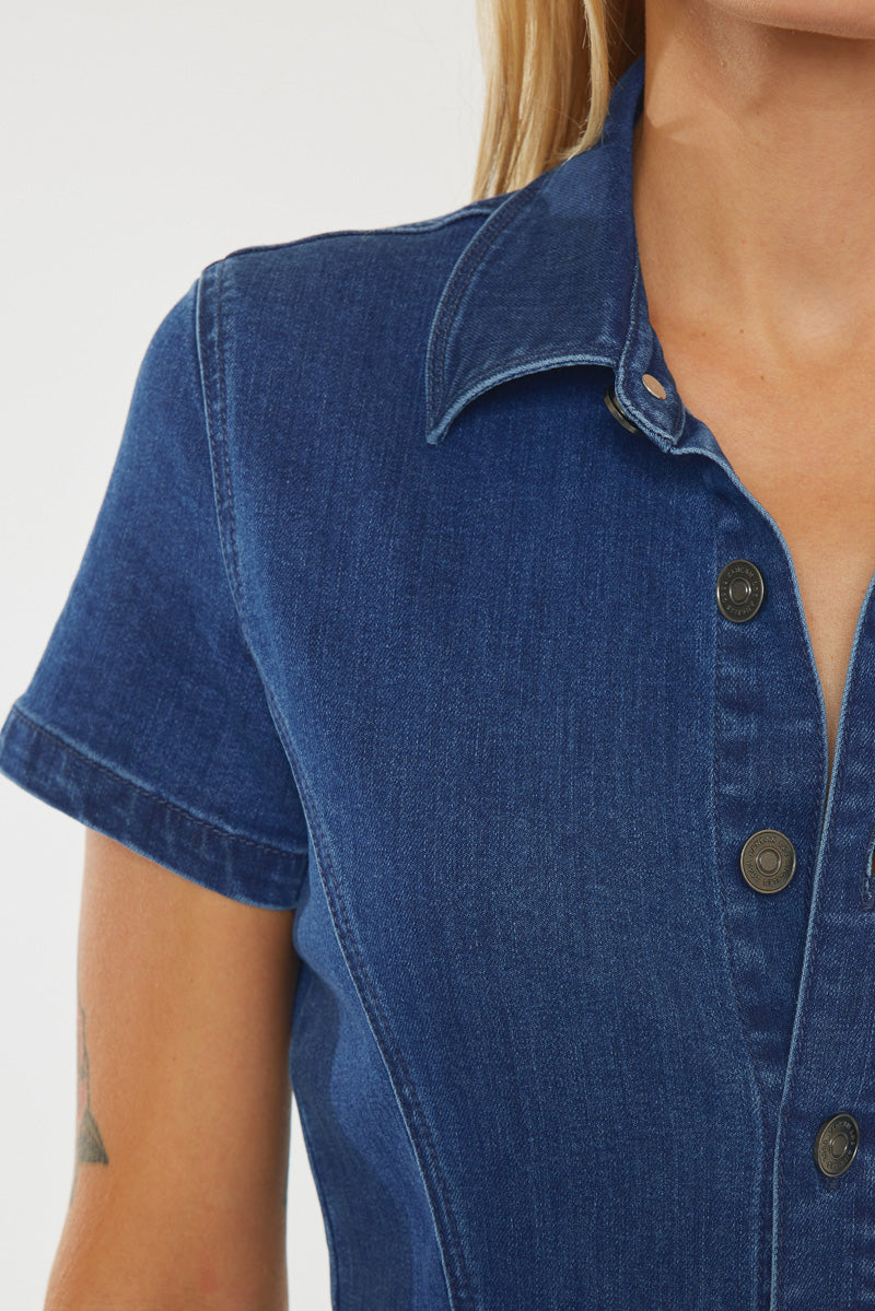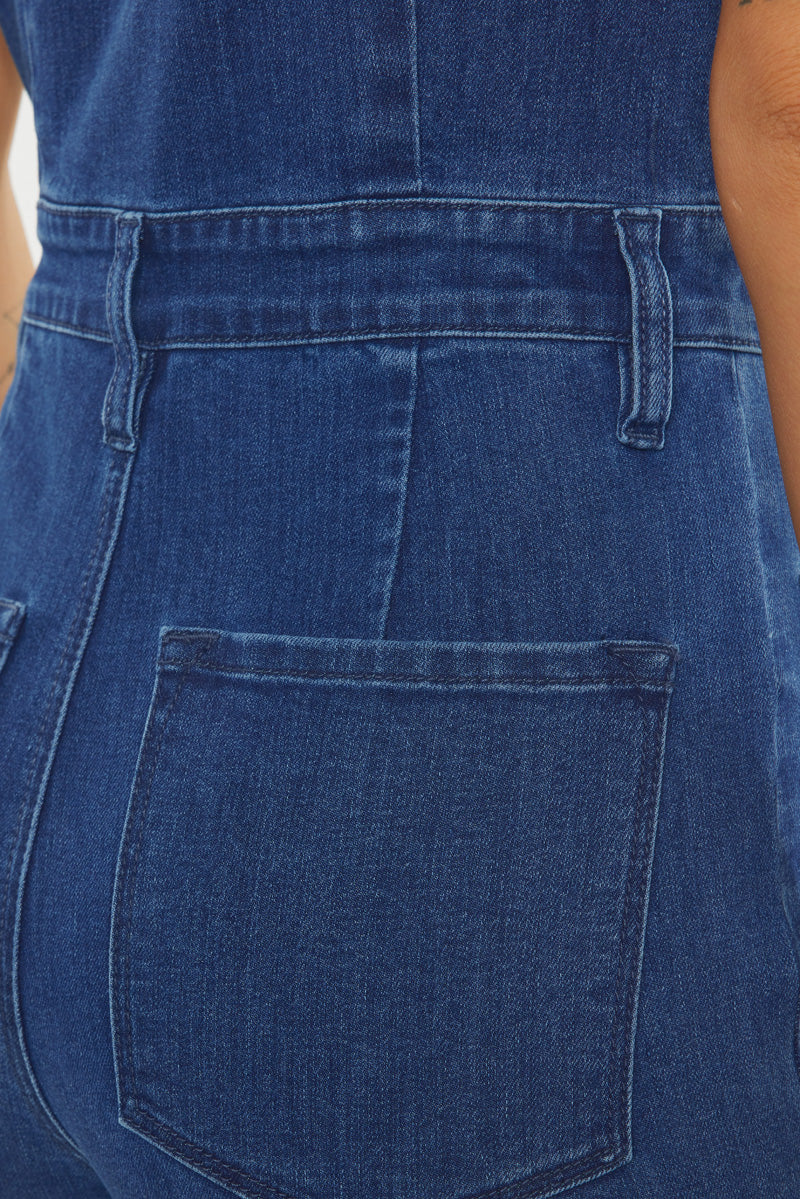 Turn heads everywhere you go with our stylish Daya Jumpsuit! You are sure to become an instant fashionista with this trendy-chic jumpsuit with a super flared leg fit in a dark blue or medium wash! Featuring a regular collar, an elastic waistband, 4 pocket design, and a button an exposed button-up front.