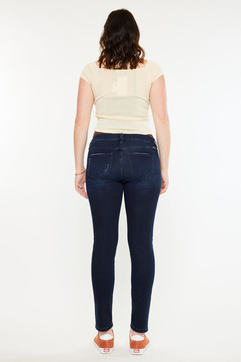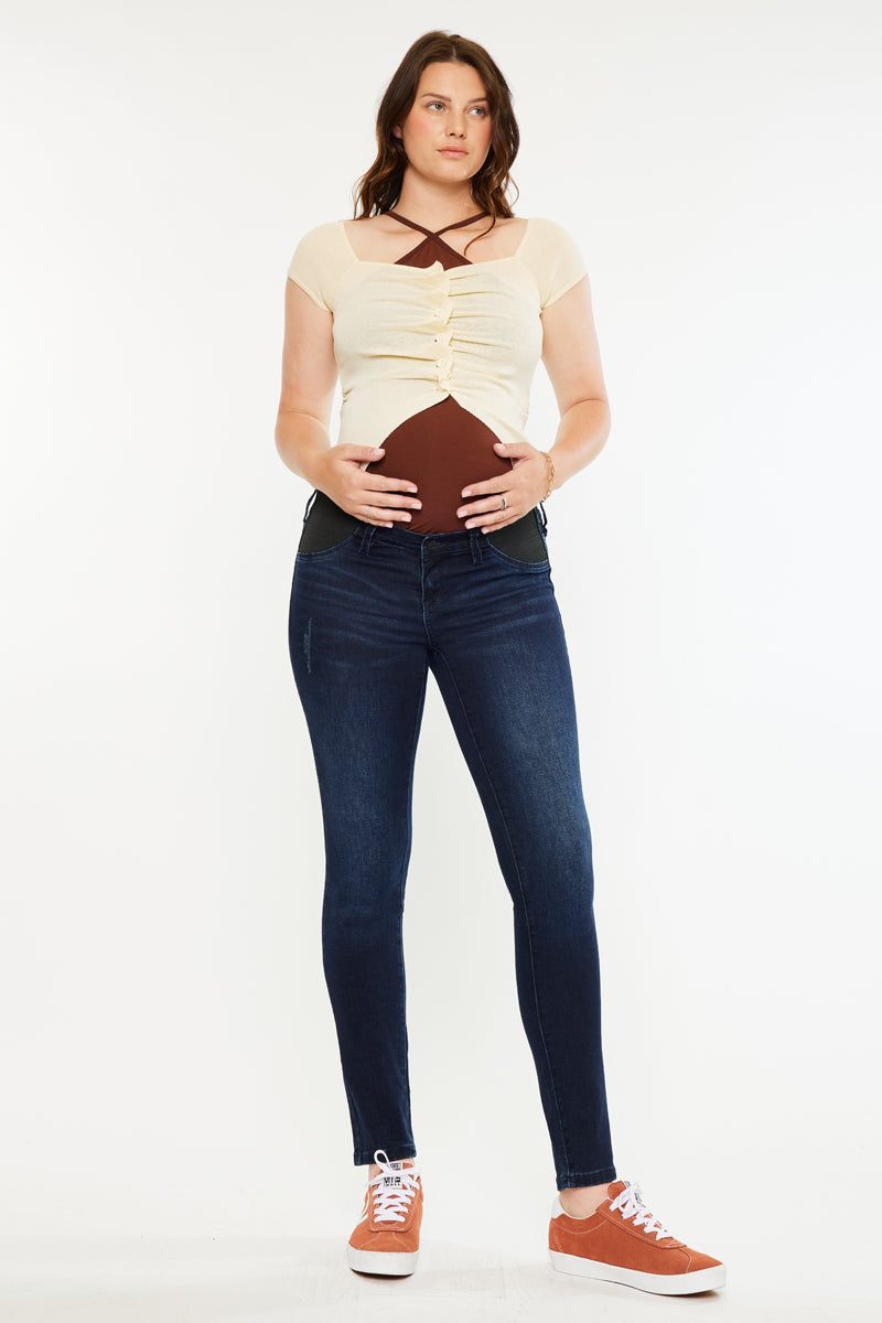 A dark-washed maternity jean featuring an insert stretch waistband. Features slight fading, a distressed hemline, and a classic ankle skinny fit that will keep you stylish even through your third trimester. Features a classic five-pocket design and a single button closure with zip fly.