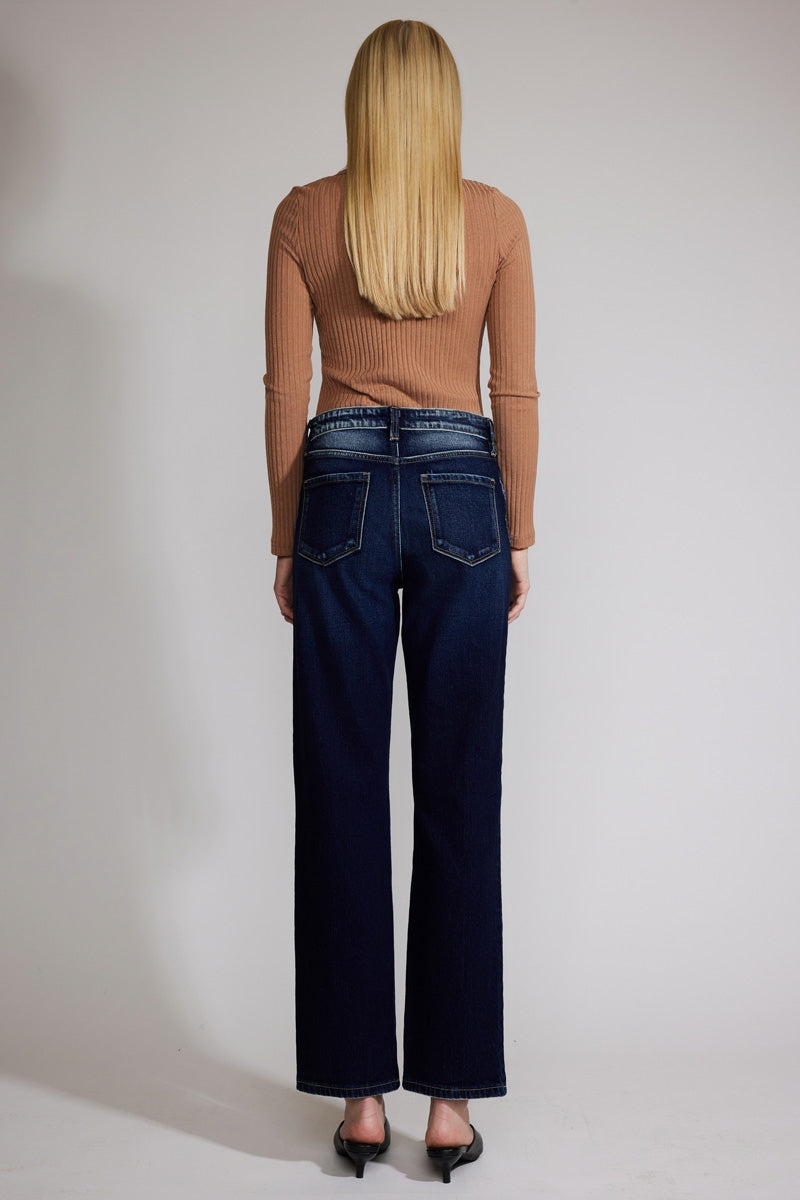 Our Delores Premier High Rise Straight Jeans are made domestically in small batches by a local wash factory in Los Angeles. Each pair of this denim is single-handly, finely washed in a beautiful dark wash color. Sits above the waist and relaxes throughout the leg for a straight leg fit. Features a 5-pocket style, one button closure, and zip fly. Feel good about what you wear in these premiere Kancan jeans.