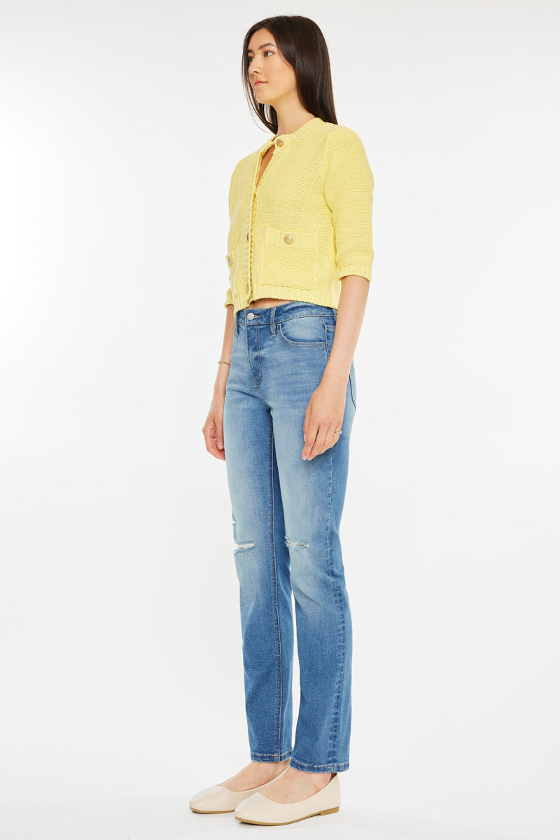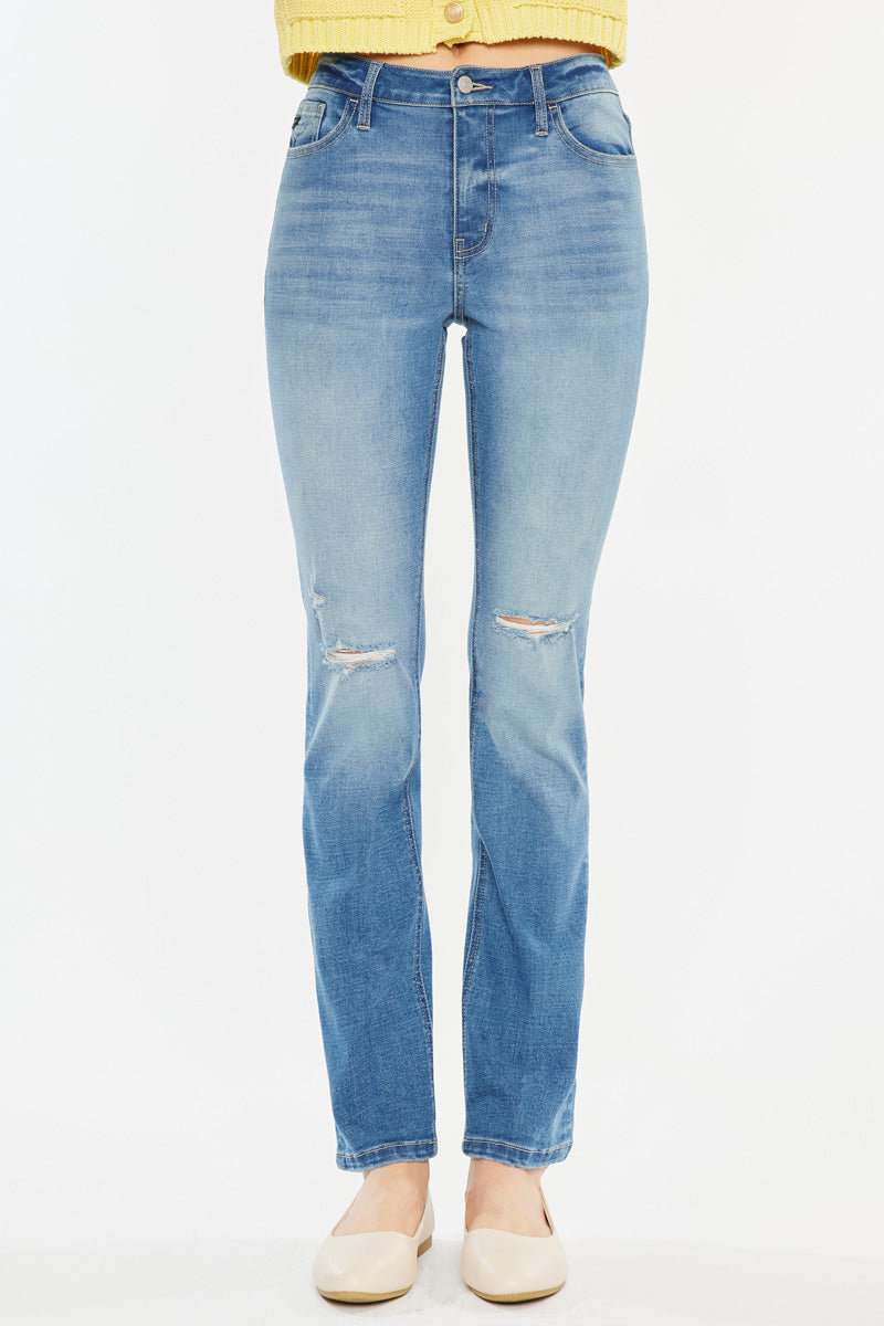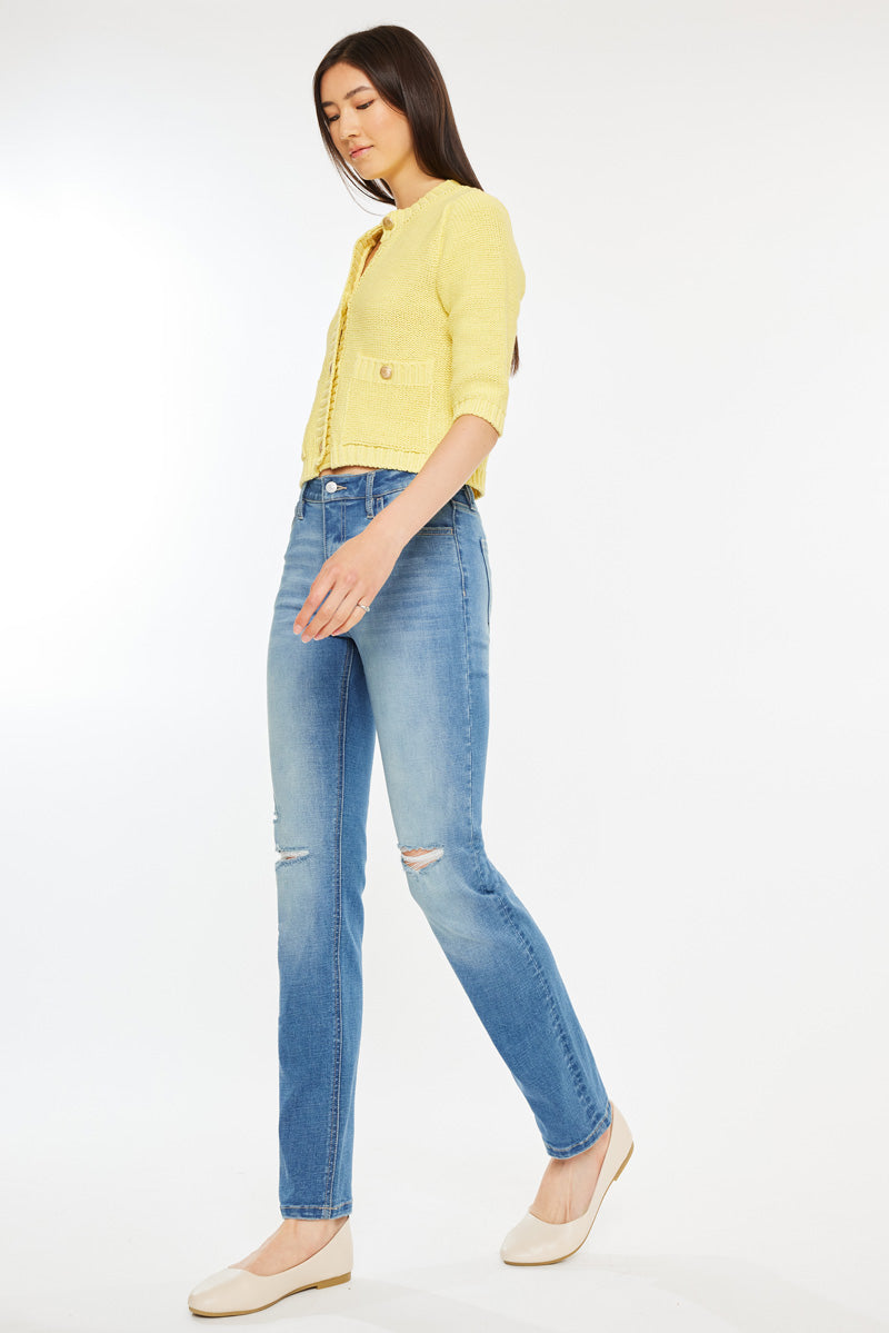 For a casual, put together every day look we have our Diana Essentials High Rise Slim Straight Jeans. It comes in a beautiful timeless medium wash color. Sitting just above the natural waistline; with a snug fit from hip to thigh and a relaxed fit from knee to leg.Crafted from our soft denim fabric, these jeans offer a stretchable fit for comfortable movement throughout the day. Features distress details at the knees, the classic 5-pocket style and single button zip fly closure.