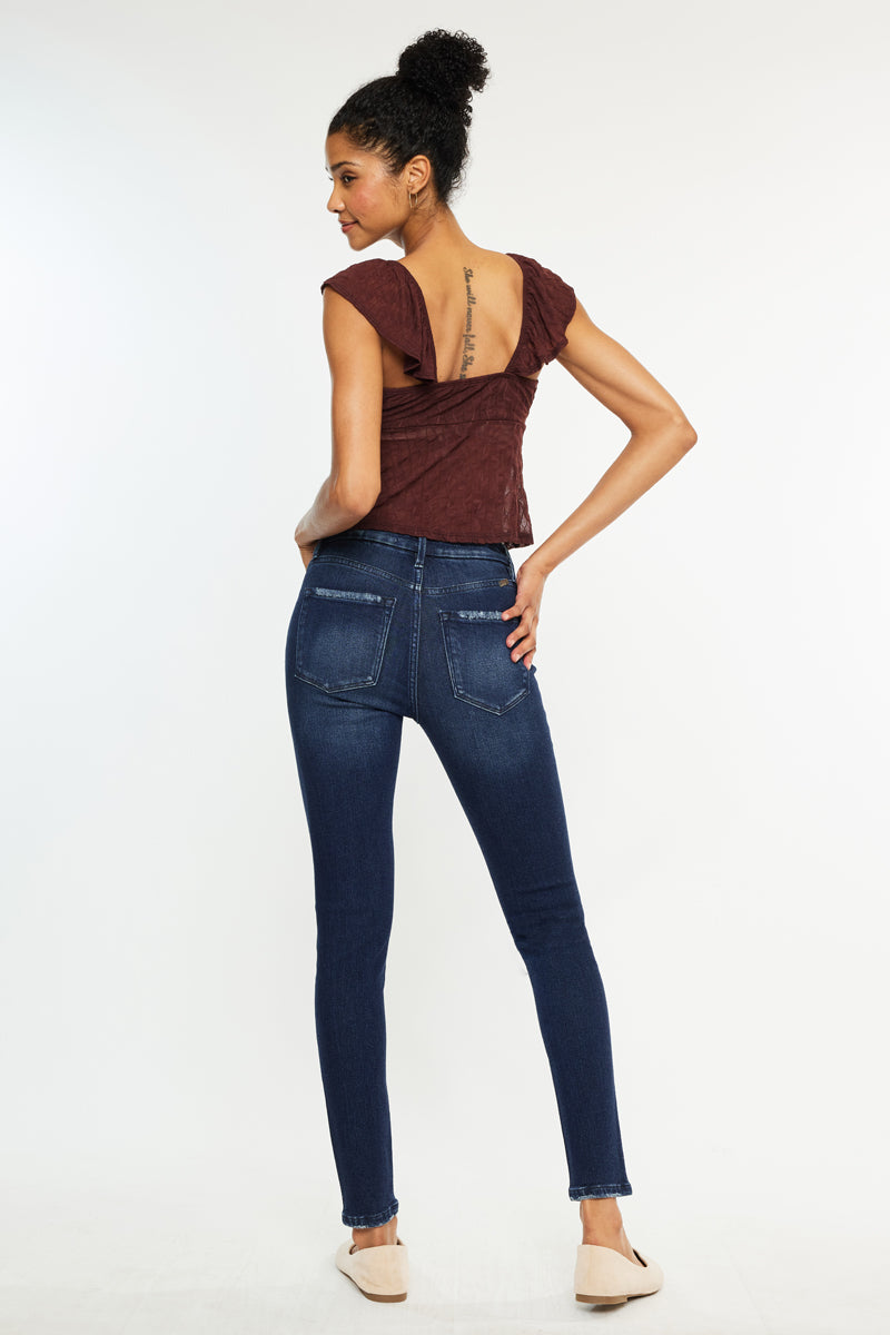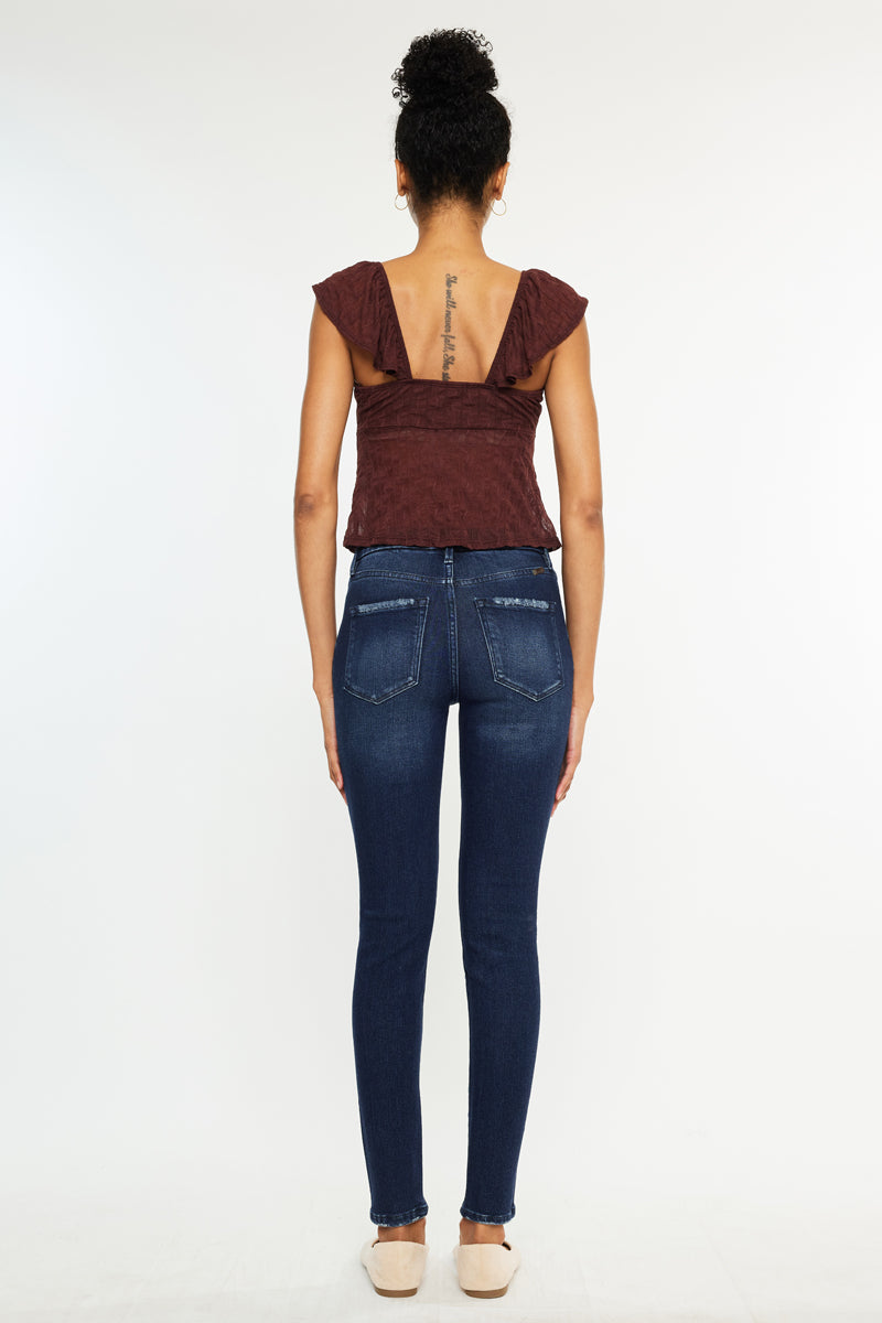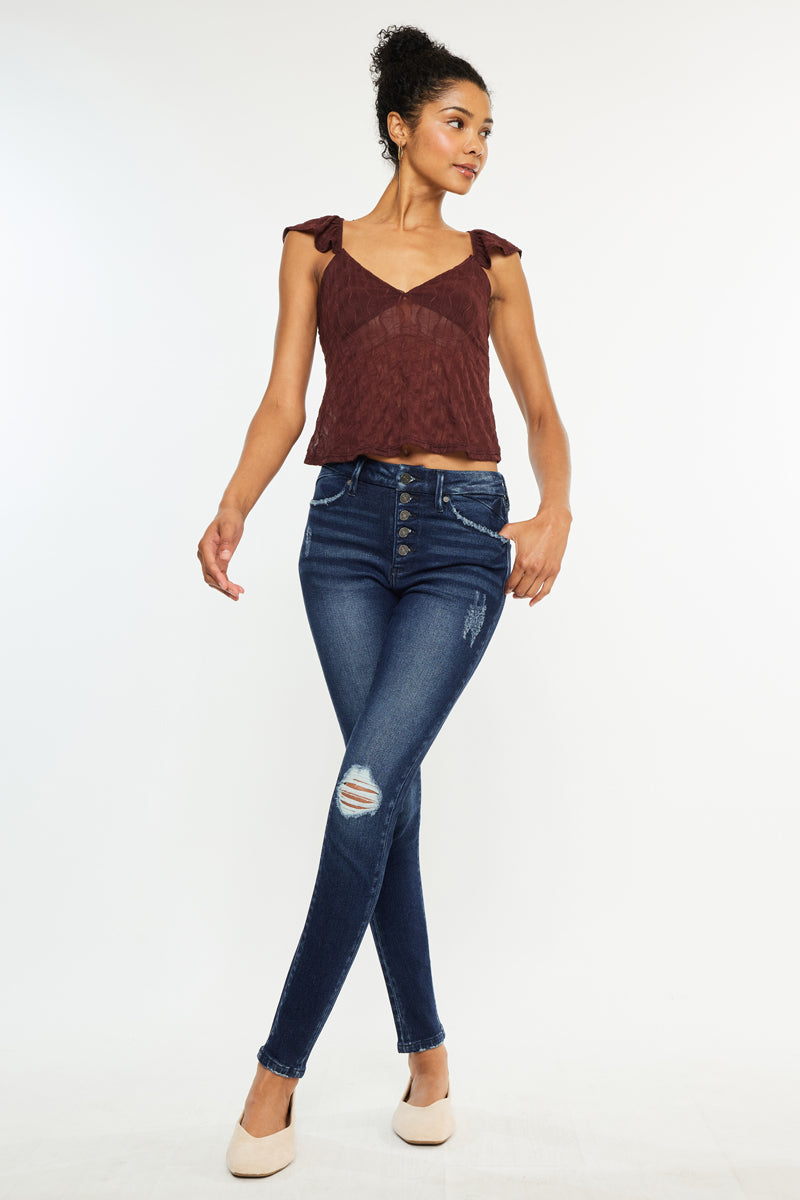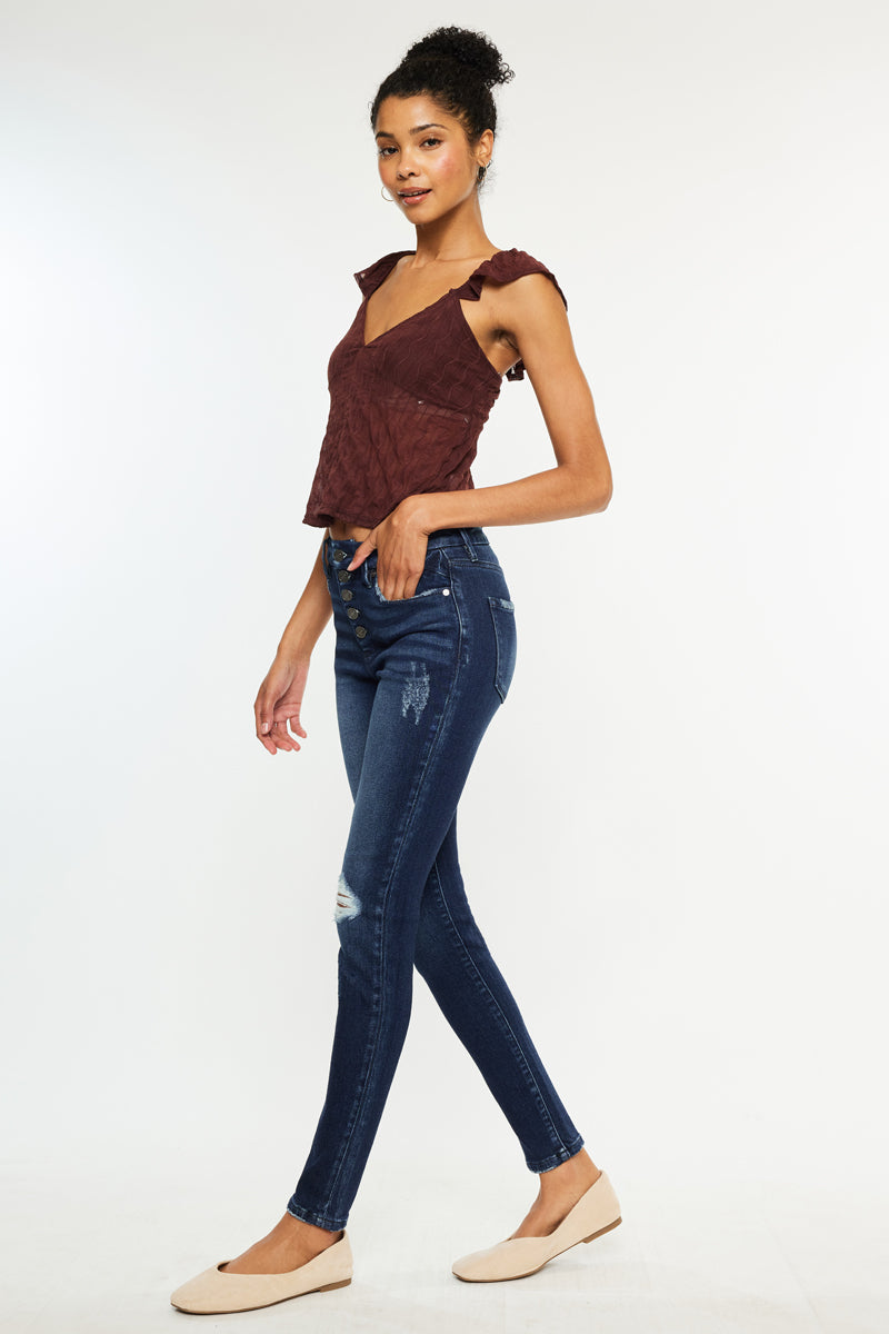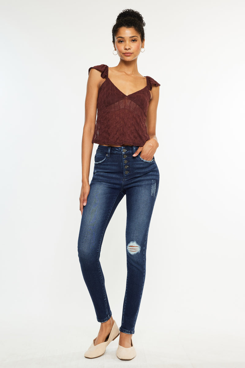 This pair of dark wash super skinny jeans create a flattering figure and accentuate your every curve! Featuring distressed details on the knees, whiskering, 5-button closure, and regular 5-pocket design.