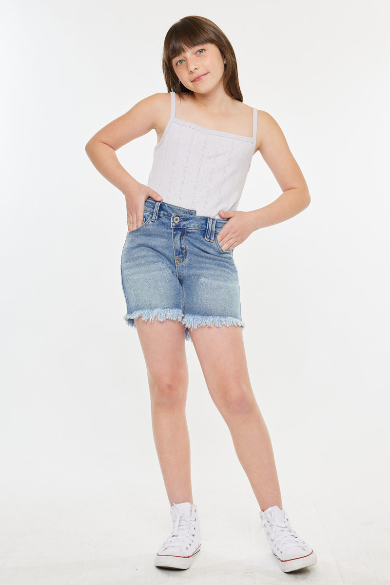 - Frayed hem, Regular 5 pockets, Single button front closure, Zip fly