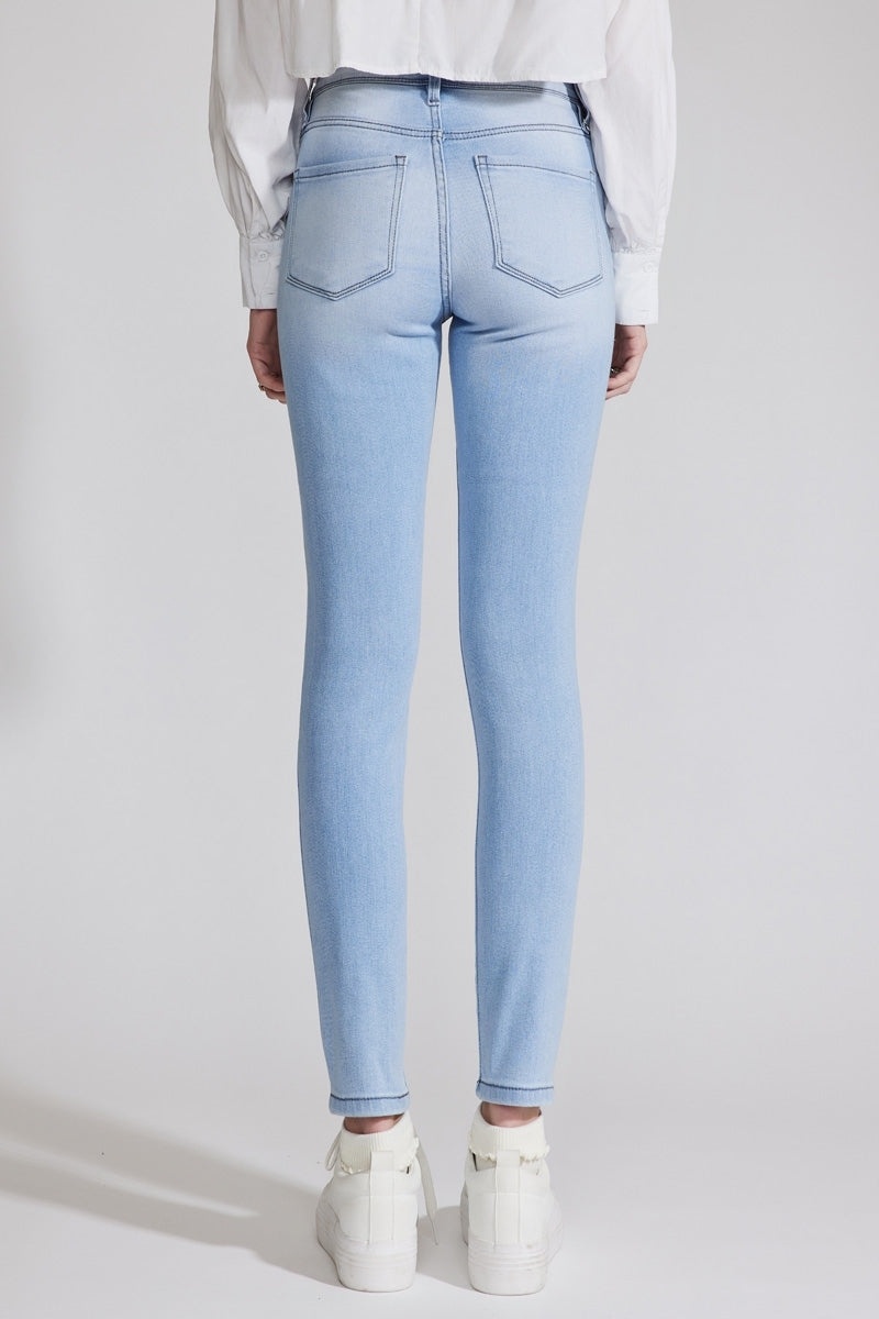 Our Drew Premier High Rise Super Skinny Jeans are made domestically in small batches by a local wash factory in Los Angeles. Each pair of this denim is single-handly, finely washed in a beautiful light color. With a light fading on the front and back. Features whiskering detail, 4-pocket style, 1 coin pocket detail, one button closure, and zip fly. Feel good about what you wear in our premiere Kancan jeans.