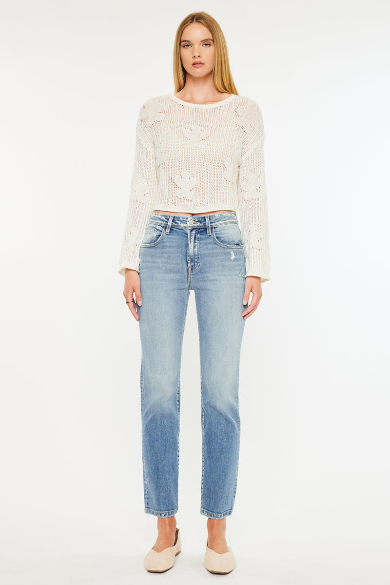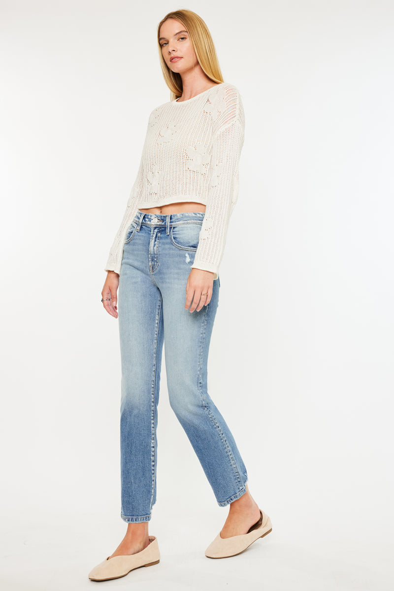 Our Ellie Premier High Rise Straight Jeans are made domestically in small batches by a local wash factory in Los Angeles. Each pair of this denim is single-handily, finely washed in a beautiful medium wash color. Sits above the waist and relaxes throughout the leg for a straight leg fit. Features a 5-pocket style, one button closure, and zip fly. Feel good in these premiere Kancan jeans.