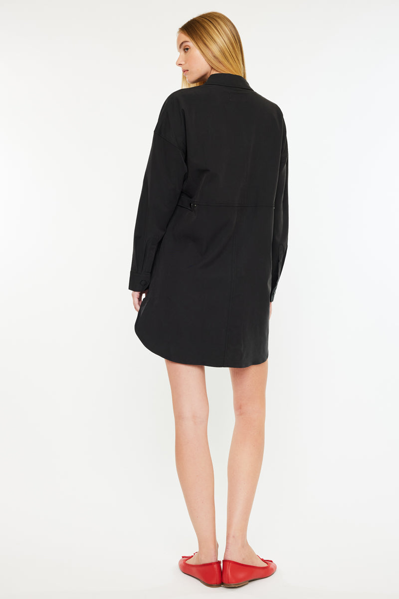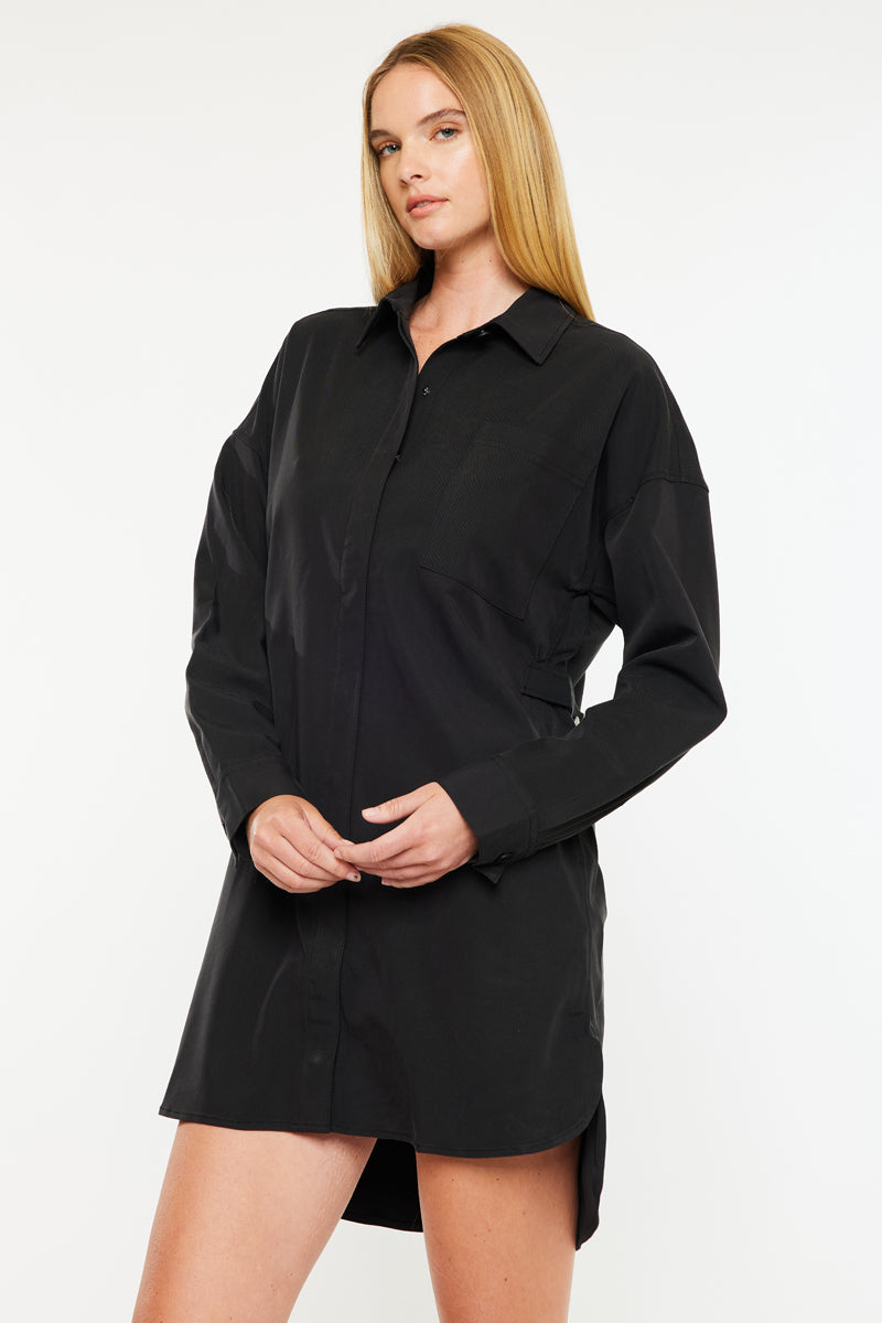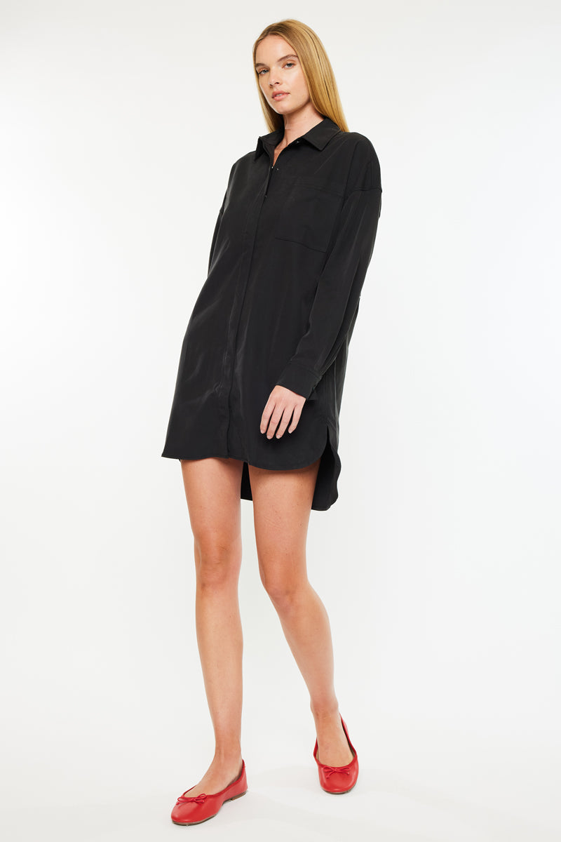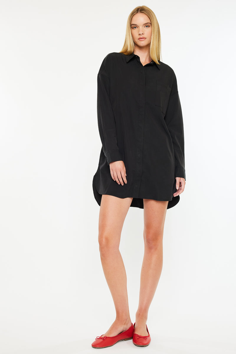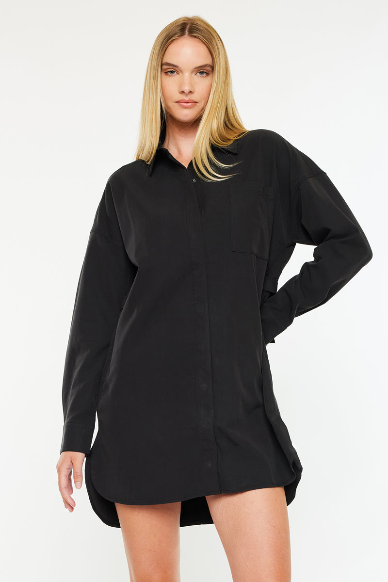 Dress up with our Emery Dress Shirt. It is the perfect wardrobe piece that can be paired with minimalistic jewelry for a classy and chic outfit. The dress shirt comes in a classic black wash and has a side slit detail. Features a front patch pocket, 2 side pockets, and a snap button closure.