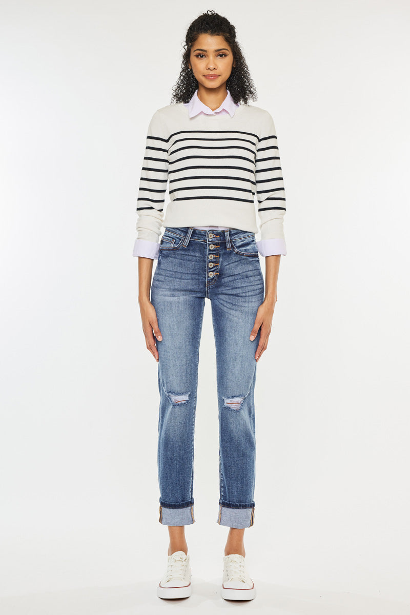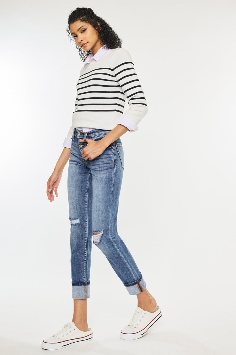 Express your style with this pair of skinny straight cut jeans featuring unfinished frayed hems, whiskering, fading, slight distressed detailing at the front, contrast stitching, a high-rise waistline, and a 5-pocket design.