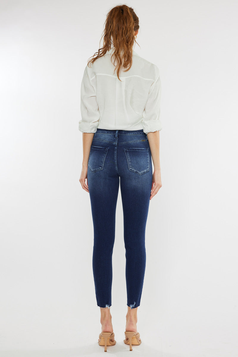 Our Evangeline High Rise Jeans come in an ankle skinny fit in a faded dark blue wash, whiskering, and subtle distress detailing. It comes with a raw hem that gives it a more rugged chic look. Sits above the natural waistline as it tapers down the leg creating a figure-flattering silhouette that's perfect for dressing up or down. Made with smooth stretch denim that allows you to move with ease without bagging out after each wear. Features a classic five-pocket design, single-button front, and zip-fly closure.
