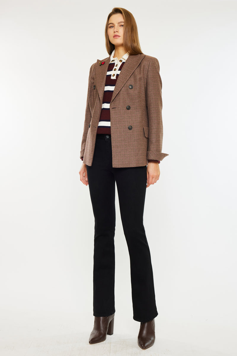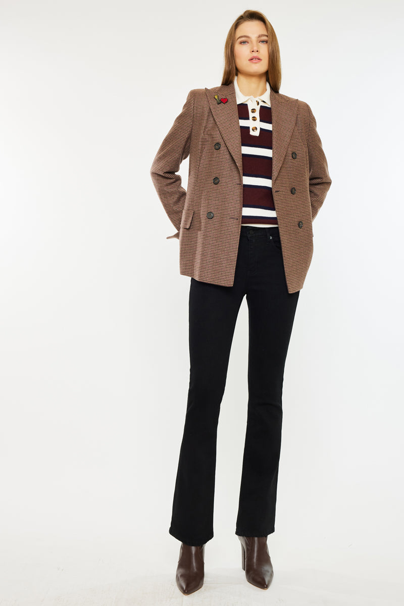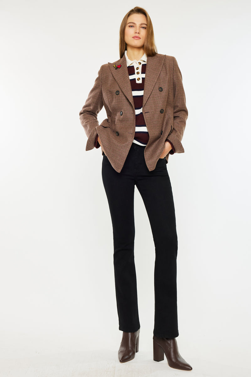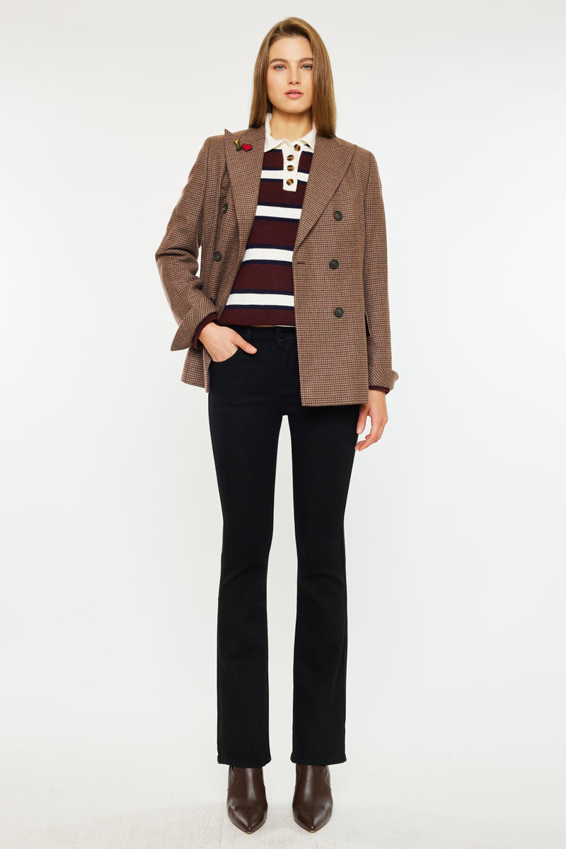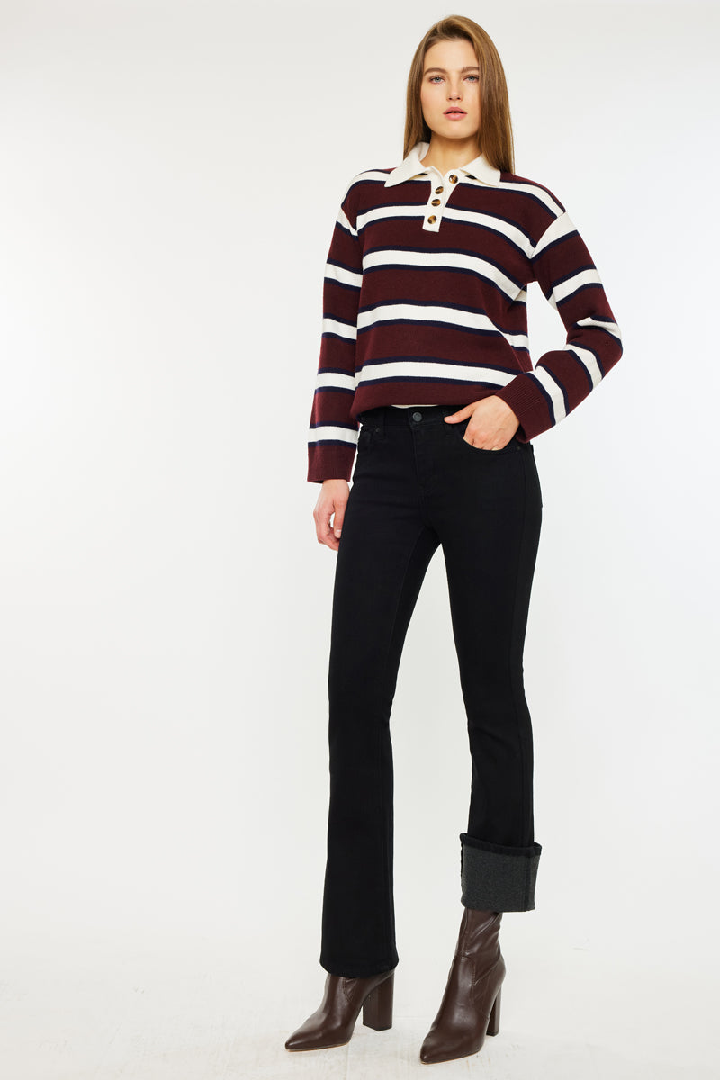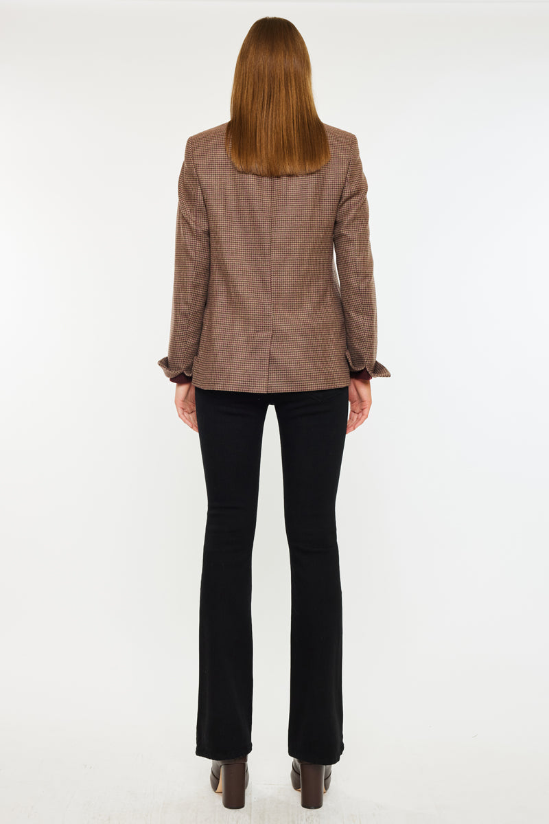 - Features a classic five-pocket design, frayed hem, single-button front, and zip-fly closure.