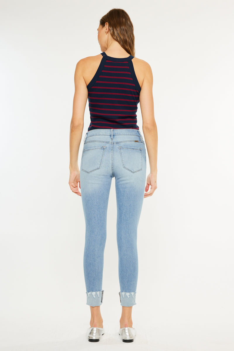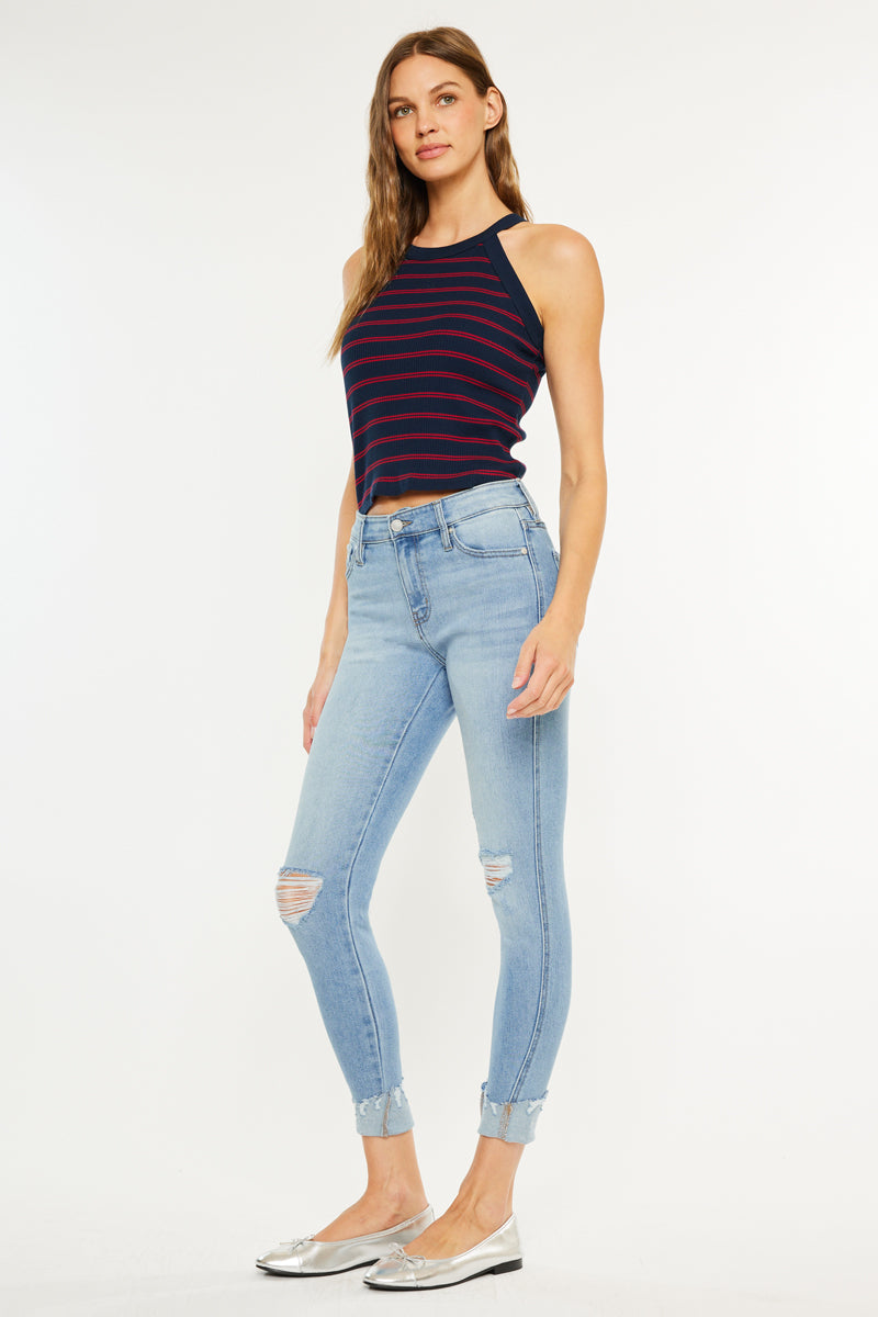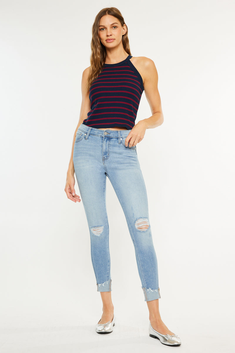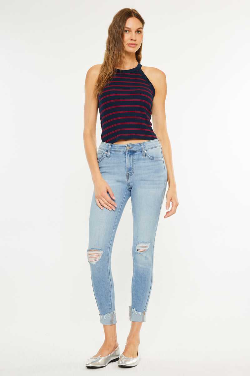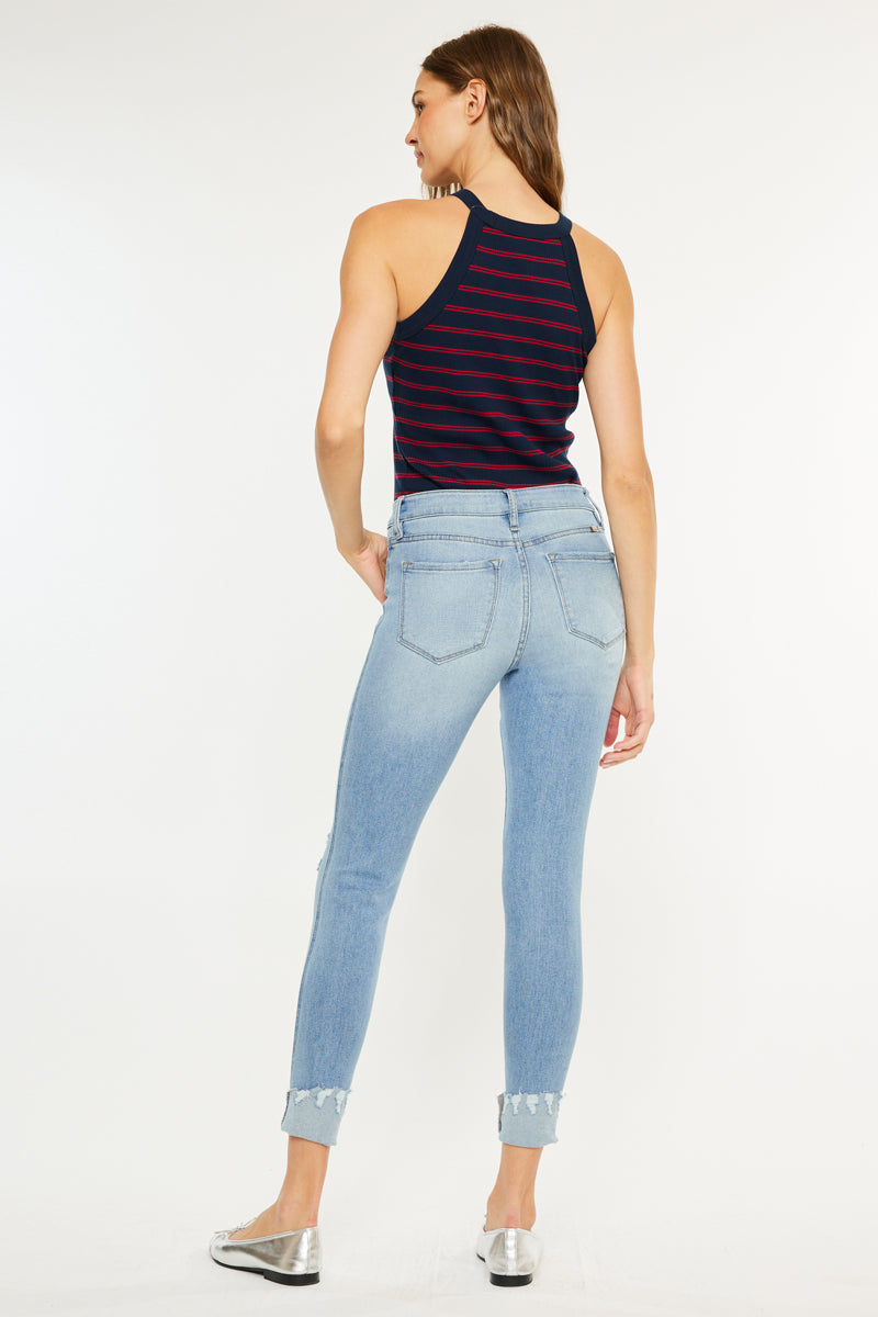 Baby blue jeans with knee destruction for a lived-in vibe. Our Fleur Mid Rise Ankle Skinny Jeans sit right at the natural waistline as they taper down the leg for a fitted silhouette that hugs lifts in all the right places. Made with stretch denim that retains its shape while allowing you to move with ease. Features a classic five-pocket design, single-button front, and zip-fly closure. Finished with silver-colored hardware.