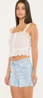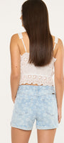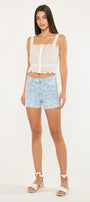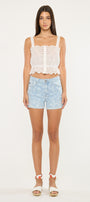 The Lilly Floral shorts comes light-washed with a daisy floral print. These shorts has a subtle distress detail along the frayed bottom hem for a more lived-in look. A classic versatile fit made with our authentic stretch denim, a open side seam, a single-button closure, and a zip fly.